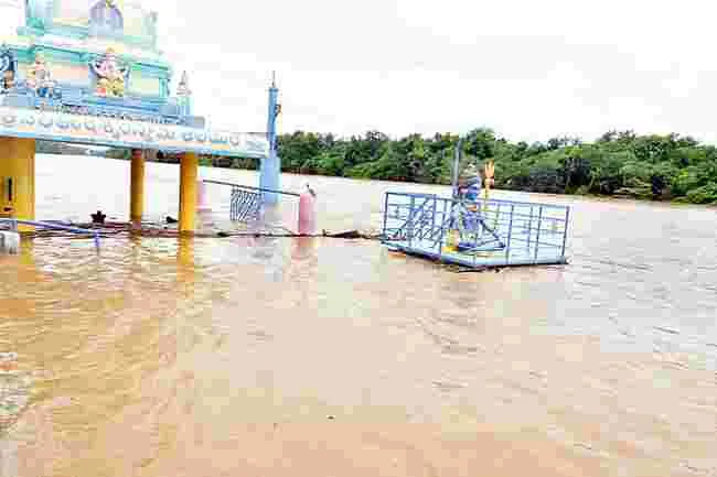 రాజమహేంద్రవరం సిటీ/కొవ్వూరు, జూలై 24 : ముంపు వీడలేదు.. ముప్పు వీడ లేదు.. గోదావరి వరద ఉధృతి తగ్గలేదు..అటు భద్రాచలం .. ఇటు ధవళేశ్వరం వద్ద రెండో ప్రమాద హెచ్చరిక కొనసాగుతూనే ఉంది. దీంతో గోదావరి పరీవాహక ప్రాంత ప్రజలు ఇంకా భయం భయంగానే గడుపుతున్నారు. ఎగువన భద్రాచలం వద్ద తగ్గుముఖం పట్టినా ధవళేశ్వరం వద్ద వరద ఉధృతి కొనసాగుతోంది.. ధవళేశ్వరం వద్ద బుధవారం తెల్లవారుజామున 14.90 అడుగుల వరకు పెరిగిన నీటిమట్టం ఆపై 8 గంటల పాటు నిలకడగా కొనసాగింది. మధ్యాహ్నం 12 గంటలకు నెమ్మదిగా తగ్గుముఖం పడుతూ రాత్రి 7 గంటలకు 14.60 అడుగులుగా నమోదైంది. రాత్రి 11 గంటలకు 14.40 అడుగులకు నీటిమట్టం చేరింది. కాటన్ బ్యారేజ్ నుంచి 13,61,297 లక్షల క్యూసెక్కులు సముద్రంలోకి ప్రవహిస్తుంది.ఈ సారి కాటన్బ్యారేజ్ నుంచి అత్యధికంగా 14,56,651 క్యూసెక్కులు ప్రవాహం సముద్రంలోకి ప్రవహించింది. ప్రస్తుతం ప్రమాద హెచ్చరికలు కొనసాగుతుండగా నీటిమట్టం తగ్గుముఖం పడుతూ ఉండడ ంతో గురువారం ఉదయానికి రెండో ప్రమాద హెచ్చరిక ఉపసంహరించేస్థాయికి నీటి మట్టం తగ్గుతుందని అధికారులు అంచనా వేస్తున్నారు. ఎందుకంటే భద్రాచలం నుంచి వరద ధవళేశ్వరం కాటన్ బ్యారేజ్కి చేరుకోవడానికి సుమా రు 18 గంటలు పడుతుంది. దీంతో అఖండ గోదావరి ఇంకా ఉధృతంగానే పొంగి ప్రవహిస్తుంది. రాజమహేం ద్రవరంలోని హేవ్లాక్ బ్రిడ్జి, ఆర్చ్ బ్రిడ్జిల మధ్య వరద ప్రవాహం చాలా వేగంగా వెళుతోంది. పుష్కరాలరేవులో గోదావరి వరద 55 అడుగులకు చేరింది.పుష్కరాల రేవు నుంచి ఎగువ కాతేరు వైపు గోదావరి వస్తున్న తీరు భయానకంగా ఉంది. కనుచూపుమేరలో అంతా వరదనీరే కనిపిస్తుంది.కొవ్వూరు గోష్పాదక్షేత్రంలోని ఆలయాలన్నీ రెండో రోజు వరద ముం పులోనే ఉన్నాయి. రాజమహేంద్రవరంలో కోటిలింగాలరేవు, చింతాలమ్మరేవు, పుష్కరాలరేవు, జీవకారుణ్యం రేవు, టీటీడీ ఘాట్, శ్రద్ధానంద ఘాట్, లాంచీల రేవు, పిండాలరేవు,దోబీఘాట్, సరస్వతి ఘాట్, గౌతమి ఘా ట్లు మునిగిపోయాయి.దీంతో ఆయా రేవులను మూసివేశారు.పుష్కరాలరేవులో నిత్య హారతిచ్చే ఘాట్ మొత్తం నీటమునిగింది. అధికారులు ముందస్తు చర్యల్లో భాగంగా ప్రతి ఘాట్లో పోలీస్ పహరా ఏర్పాటు చేశారు.గోష్పాదక్షేత్రానికి వెళ్ళే అన్ని రహదారులు బారికేడ్లు ఏర్పాటుచేసి మూసివేశారు.పోలీసు, రెవెన్యూ, సచివాలయ సిబ్బంది 24 గంటలు మూడు షిప్టులుగా పర్యవేక్షిస్తున్నా రు.మెడికల్ క్యాంపులు కొనసాగిస్తున్నారు. కొవ్వూరు గోష్పాదక్షేత్రం వద్ద వరదను డీఎంహెచ్వో వెంకటేశ్వరరావు పరిశీలించారు. సిబ్బందికి పలు సూచనలు చేశారు. వరద బాధిత ప్రాంతాల్లో శిబిరాలు ఏర్పాటు చేయాలన్నారు.