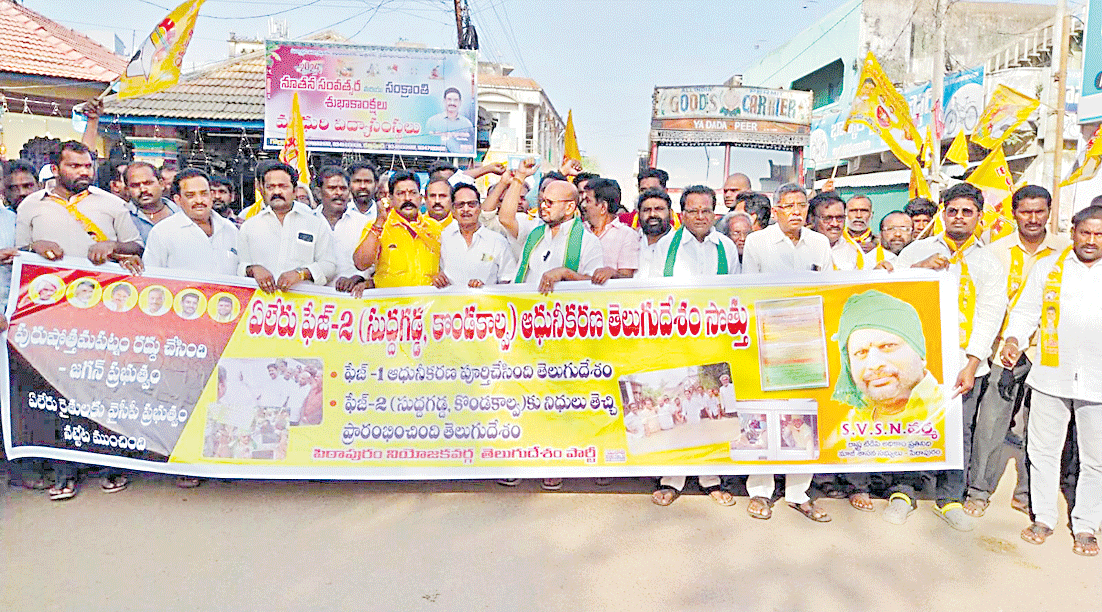 గొల్లప్రోలు, జనవరి 6: ఏలేరు, సుద్దగడ్డ ఆధు నికీకరణ పనులు తక్షణం చేపట్టాలంటూ పిఠాపురం మాజీ ఎమ్మెల్యే, టీడీపీ రాష్ట్ర అధికార ప్రతినిధి ఎస్వీఎస్ఎన్ వర్మ ఆధ్వర్యంలో శనివారం ఆందోళన చేపట్టారు. ప్రధాన రహదారులపై ప్రదర్శన జరిపి గొల్లప్రోలు తహశీల్దారు కార్యాలయం వద్ద ధర్నా, రాస్తారోకో నిర్వహించారు. పనులపై వైసీపీ ప్రభుత్వ తీరును నిరసిస్తూ నినాదాలు చేశారు. వరద ముంపు నుంచి శాశ్వత రక్షణతో పాటు సాగునీటి సమస్య పరిష్కా