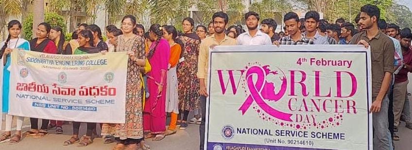 ప్రపంచ కేన్సర్ నివారణ దినోత్సవం సందర్భంగా వీఆర్ సిద్ధార్థ ఇంజనీరింగ్ కళాశాలలో ఎన్ఎస్ఎస్ విభాగం వలంటీర్లు వందడుగుల రోడ్డు వరకు ర్యాలీ నిర్వహించారు. శరీరంలో మార్పులను గమనించాలని, ఆరోగ్యకరమైన జీవనశైలిని అనుసరించాలని, రోజూ వ్యాయామానికి కొంత సమ యం కేటాయించాలని, జంక్ ఫుడ్కు దూరంగా ఉండాలని ప్లకార్డులు ప్రదర్శించా రు.