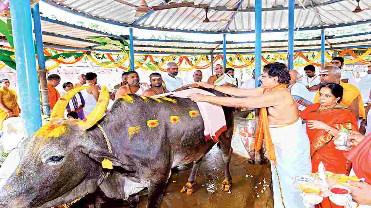 శ్రీశైలం, ఆగస్టు 26: శ్రీశైలం మహాక్షేత్రంలో సోమవారం కృష్ణాష్టమిని పురస్కరించుకుని ఆలయ ప్రాంగణంలోని శ్రీగోకులం, దేవస్థానం గో సంరక్షణశాలలోని గోవులకు, గోవత్సాలకు విశేషంగా పూజాధికాలు నిర్వహించారు. కార్యక్రమంలో లోకకల్యాణాన్ని ఆకాంక్షిస్తూ అర్చకులు, వేదపండితులు పూజాసంకల్పాన్ని పఠించారు. అనంతరం శ్రీసూక్తంతోనూ, గో అష్టోత్తరమంత్రంతోనూ, గోవులకు షోడశ ఉపచారాలతో పూజాధికాలు జరిపి గోవులకు నివేదన, నీరాజన మంత్రపుష్పాలు సమర్పించారు. తరు వాత దేవస్థానం గో సంరక్షణశాలలోని కృష్ణునికి విశేష పూజలు జరిపారు. కార్యక్రమంలో ఆలయ కార్యనిర్వహణాధికారి డి.పెద్దిరాజు దంపతులు, సహాయ కార్యనిర్వహణాధికారి మోహన్, పర్యవేక్షకులు స్వర్ణలత, అర్చకులు, వేదపండితులు, సంబంధిత సిబ్బంది పాల్గొన్నారు.