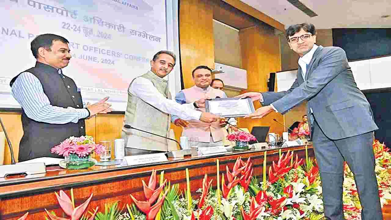 విజయవాడ, జూన్ 26 (ఆంధ్రజ్యోతి): ప్రజలకు అత్యుత్తమ సేవలు అందించినందుకు విజయవాడ ప్రాంతీయ పాస్పోర్టు కార్యాలయం ఉత్తమ పాస్పోర్టు కార్యాలయ అవార్డును అందుకొంది. 2023-24 ఆర్థిక సంవత్సరానికి ఈ అవార్డును సాధించింది. విదేశీ వ్యవహారాల మంత్రిత్వ శాఖ నేతృత్వంలో ఈ నెల 22 నుంచి 24వ తేదీ వరకు ఢిల్లీలో ప్రాంతీయ పాస్పోర్టు అధికారుల సదస్సు నిర్వహించారు. కేంద్ర విదేశాంగ మంత్రి ఎస్.జైశంకర్ పాల్గొన్న ఈ సదస్సులో విజయవాడ ప్రాంతీయ పాస్పోర్టు కార్యాలయ అధికారి శివ హర్ష ఈ అవార్డును అందుకున్నారు. విజయవాడ ప్రాంతీయ పాస్పోర్టు కార్యాలయం పరిధిలోకి విజయవాడ, తిరుపతి పాస్పోర్టు సేవా కేంద్రాలు(పీఎ్సకే)లతో పాటు 13 పోస్టాఫీసు పాస్పోర్టు సేవా కేంద్రాలు(పీఓపీఎ్సకే)లు వస్తాయి. విజయవాడ ప్రాంతీయ పాస్పోర్టు కార్యాలయం పరిధిలో 2023-24 ఆర్థిక సంవత్సరంలో 3,70,123 పాస్పోర్టు సంబంధిత సేవలను అందించారు. ఇంత భారీ సంఖ్యలో పాస్పోర్టులను జారీ చేసేందుకు విజయవాడ ప్రాంతీయ పాస్పోర్టు కార్యాలయం జరిపిన కృషిని కేంద్ర విదేశాంగ శాఖ గుర్తించింది. ప్రజల నుంచి ఉన్న డిమాండ్ను దృష్టిలో ఉంచుకొని ఎక్కువ గంటలు పనిచేయటం, స్లాట్స్ సంఖ్య పెంచడం, ప్రణాళికాబద్ధంగా వ్యవహరించటం, సులభతరమైన సేవలను అందించటం, పోస్టల్, పోలీసు శాఖలతో సమన్వయం పెంపొందించుకోవటం ద్వారా వేగంగా, అత్యుత్తమంగా విజయవాడ ప్రాంతీయ పాస్పోర్టు కార్యాలయం సేవలు అందించగలిగింది. విజయవాడ ప్రాంతీయ పాస్పోర్టు కార్యాలయం కొత్త భవనంలోకి చేరింది. విజయవాడ పాత బస్టాండ్ సమీపంలో బందరురోడ్డులోని భారీ బహుళ అంతస్థుల భవనంలో కార్యాలయాన్ని ఏర్పాటు చేశారు. పరిపాలనా కార్యాలయం కొత ్త భ వనంలో కొలువు తీరింది.