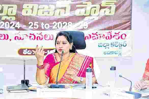అనకాపల్లి, అక్టోబరు 4 (ఆంధ్రజ్యోతి): అందరి సహకారంతోనే స్వర్ణాంధ్ర-2047 విజన్ ప్రణాళిక అమలు సాధ్యమని, వైసీపీ పాలనలో ఐదేళ్లు వెనుకబడిన రాష్ట్రాన్ని విజనరీ ముఖ్యమంత్రి చంద్రబాబు సారథ్యంలో స్వర్ణాంధ్రగా మార్చుకోవాల్సిన అవసరం ఎంతైనా వుందని రాష్ట్ర హోం మంత్రి వంగలపూడి అనిత అన్నారు. జిల్లా కలెక్టర్ విజయకృష్ణన్ ఆధ్వర్యంలో శుక్రవారం కలెక్టరేట్ సమావేశ మందిరంలో స్వర్ణాంధ్ర-2047 విజన్ ప్రణాళిక అమలుపై అధికారులతో సమీక్షా సమావేశం నిర్వహించారు. ఈ సందర్భంగా మంత్రి మాట్లాడుతూ, రాష్ట్రాన్ని ప్రగతిపథంలో నడిపేందుకు స్వర్ణాంధ్ర-2047 ప్రణాళిక తయారీలో అధికారులతో పాటు ప్రజలు కూడా భాగస్వాములవ్వాలని పిలుపునిచ్చారు. పరిశ్రమల ఏర్పాటుతో యువతకు ఉద్యోగ, ఉపాధి అవకాశాలు మెరుగుపడతాయన్నారు. గ్రామీణ ప్రాంతం అధికంగా వున్న అనకాపల్లి జిల్లాలో వ్యవసాయం, పర్యాటకం, మత్స్య రంగాలను మరింత విస్తరింపజేయవచ్చన్నారు. అన్ని వర్గాల ప్రజల సూచనలు తీసుకొని సమగ్ర ప్రణాళికను రూపొందిస్తే రాబోయే 22 ఏళ్లలో అనుకున్న లక్ష్యాలను సాధించవచ్చని ఆమె అన్నారు. భవిష్యత్తులో రాష్ట్రాన్ని అన్ని రంగాల్లో ముందుకుతీసుకెళ్లి, ప్రత్యేక గుర్తింపు వచ్చేలే స్వర్ణాంధ్ర-2047 విజన్ ప్రణాళికను తయారు చేసుకోవాల్సిన అవసరం ఉందన్నారు. సమాజంలో వివిధ వర్గాలు, రంగాలకు చెందిన వారి విజన్ ప్రణాళిక రూపొందించేందుకు సూచనలు సలహాలు తీసుకుని ప్రణాళికలో పొందుపర్చాలని అధికారులను ఆదేశించారు. అంతకుముందు అధికారులు ప్రాథమికంగా రూపొందించిన స్వర్ణాంధ్ర విజన్ ప్రణాళిక వివరాలను కలెక్టర్ విజయకృష్ణన్ మంత్రికి పవర్ పాయింట్ ప్రజంటేషన్ ద్వారా వివరించారు. ఈ సమావేశంలో జేసీ జాహ్నవి, డీఆర్ఓ దయానిధి, సీపీఓ రామారావు, వివిధ శాఖల జిల్లా అధికారులు హాజరై నివేదికలను అందజేశారు.
