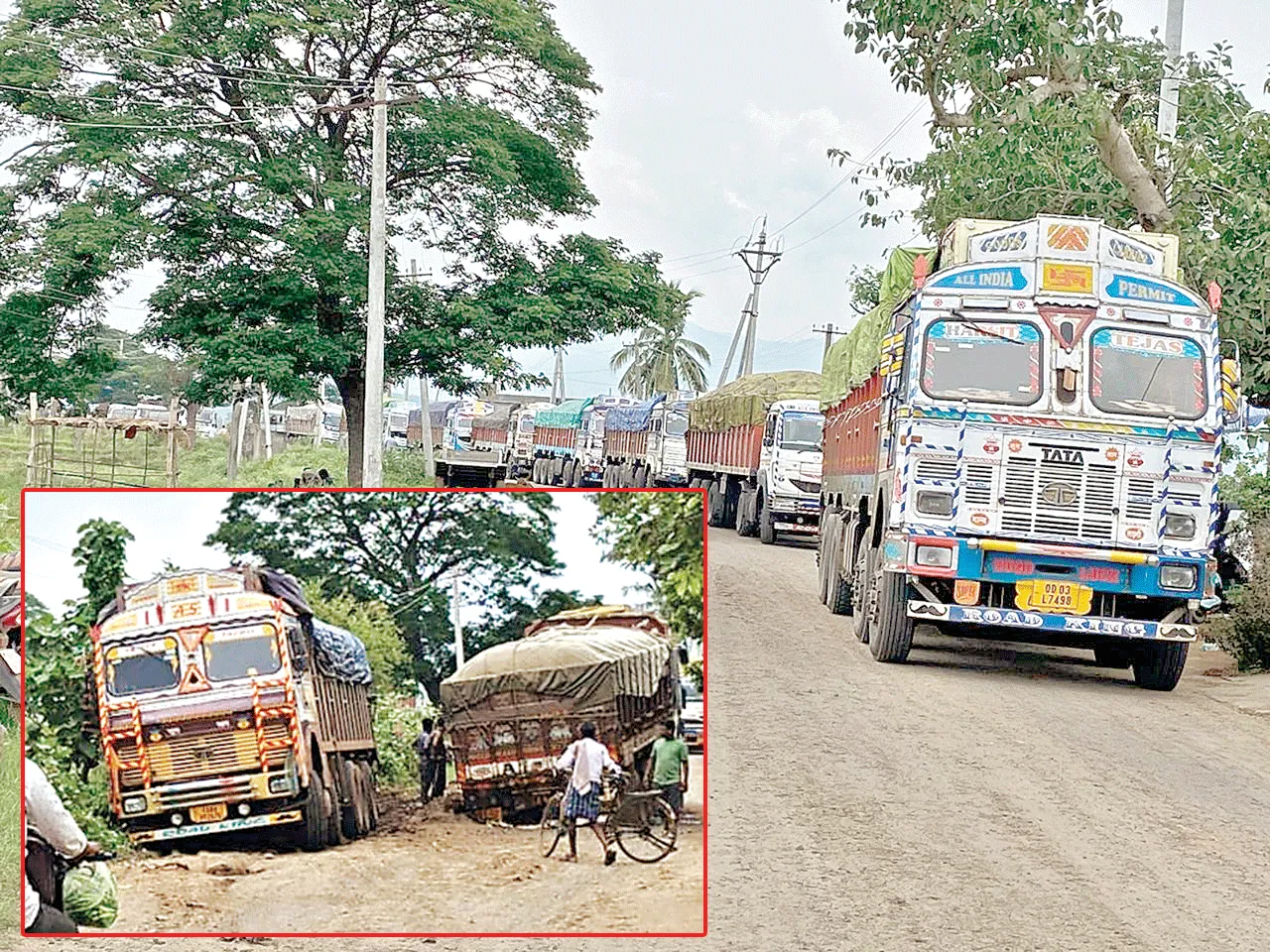 రోడ్డు మధ్యలో ఇరుక్కున్న లారీలు