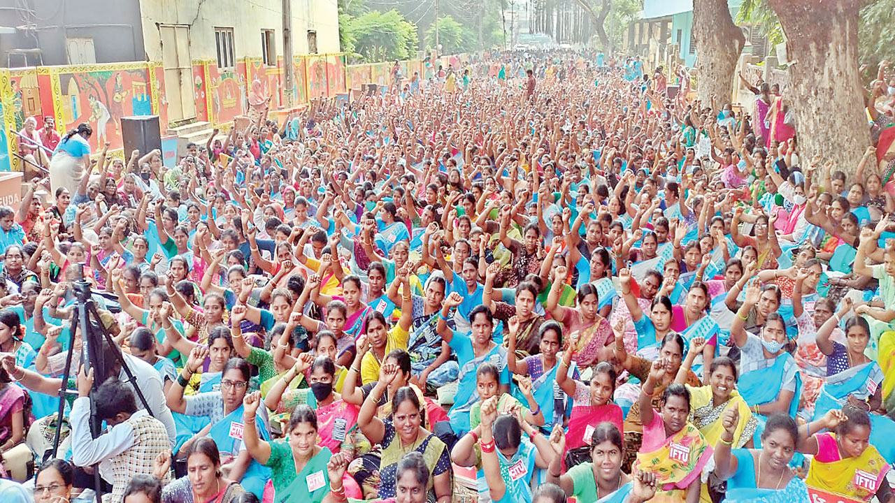 ఏలూరు కలెక్టరేట్/ భీమవరం అర్బన్/భీమవరం క్రైం/, జనవరి 3 : అంగన్వాడీలు పిడికిళ్లు బిగించారు. ప్రభుత్వంతో అమీతుమీకి సిద్ధమయ్యారు. అరెస్టులకు భయపడేది లేదని తేల్చి చెప్పారు. భీమవరం మహిళలు పెద్ద ఎత్తున ర్యాలీగా వచ్చి బైఠాయించారు. ఈ సందర్భంగా పోలీసులు అడ్డుకోవ డం తీవ్ర ఉద్రిక్తతలకు దారితీసింది. 23 రోజులుగా చేస్తున్న సమ్మెలో భాగంగా ప్రభుత్వ విధానాలను నిరసిస్తూ అంగన్ వాడీ వర్కర్స్ అండ్ హెల్పర్స్ యూనియన్ పిలుపు మేరకు భీమవరంలో బుధవారం నిరసన సభ నిర్వహించారు. సభకు అనుమతి తీసుకున్నప్పటికీ తెల్లవారుజాము నుంచి సీఐటీ యూ నాయకులు, అంగన్వాడీ నాయకులను మొత్తం 150 మందిని అదుపులోకి తీసుకుని టూ టౌన్ పోలీస్ స్టేషన్కు, అక్కడి నుంచి జిల్లా రైస్ మిల్లర్స్ భవనానికి తరలించారు. విషయం తెలుసుకున్న మిగిలిన సిబ్బంది, నాయకులు ర్యాలీ గా ప్రకాశంచౌక్ చేరుకుని బైఠాయించి నిరసన తెలిపారు. దీంతో ఉద్రిక్తత నెలకొంది. కొన్ని వాహనాలు నిలిచిపోయా యి. భీమవరం డీఎస్పీ శ్రీనాథ్, సీఐలు జి.శ్రీనివాస్, సత్యనారాయణ సిబ్బంది కలిసి సీఐటీయూ నాయకులు వాసుదేవరావును, వ్యవసాయ కార్మిక సంఘం జిల్లా కార్యదర్శి జెక్కంశెట్టి సత్యనారాయణలను బలవంతంగా ఆటోలో స్టేషన్కు తరలించారు. దీంతో అంగన్వాడీ సిబ్బంది నినాదాలు చేశారు. అదు పులోకి తీసుకున్న నాయకులను వెంటనే వదిలి పెట్టాలని డిమాండ్ చేశారు. సీఎంతోపాటు పోలీసులకు వ్యతిరేకంగా నినాదాలు చేశారు. దీంతో ప్రకాశం చౌక్ హోరెత్తింది. ఇక్కడి నుంచి లేవాలంటే ముందు అరెస్టు చేసిన నాయకులను విడుదల చేయాలని అంగన్వాడీలు స్పష్టం చేయడంతో పోలీసు లు వారిని విడుదల చేసి మునిసిపల్ ఆఫీసు వరకు ఊరేగిం పుగా వెళ్లి, సభ జరుపుకోవడానికి అనుమతి ఇచ్చారు.