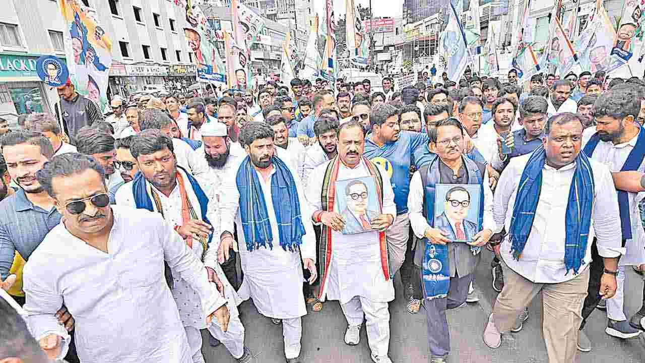 హైదరాబాద్ సిటీ/ కవాడిగూడ, డిసెంబరు 24 (ఆంధ్రజ్యోతి): కేంద్ర హోంమంత్రి అమిత్షాను వెంటనే మంత్రివర్గం నుంచి బర్తరఫ్ చేయాలని, దేశ ప్రజలకు అమిత్షా క్షమాపణ చెప్పాలని పలువురు కాంగ్రెస్ నేతలు డిమాండ్ చేశారు. పార్లమెంటులో రాజ్యాంగ నిర్మాత అంబేడ్కర్ ను అవమాన పరిచేవిధంగా అమిత్షా మాట్లాడడంపై ఏఐసీసీ దేశవ్యాప్తంగా నిరసనలకు పిలుపునివ్వగా.. మంగళవారం టీపీసీసీ ఆధ్వర్వాన హైదరాబాద్ లోయర్ ట్యాంక్బండ్లోని అంబేడ్కర్ విగ్రహం నుంచి హైదరాబాద్ కలెక్టరేట్ వరకు భారీ నిరసన ప్రదర్శన చేపట్టారు. తొలుత అంబేడ్కర్ విగ్రహానికి పూలమాలలు వేసి ఘనంగా నివాళులర్పించారు. అనంతరం అక్కడే బైఠాయించిన కాంగ్రెస్ నేతలు, కార్యకర్తలు అమిత్షాకు వ్యతిరేకంగా పెద్దఎత్తున నినాదాలు చేశారు. అనంతరం ర్యాలీగా ఏఐసీసీ జాతీయ కో-ఆర్డినేటర్ కొప్పుల రాజు, టీపీసీసీ చీఫ్ మహేశ్ కుమార్ గౌడ్ తదితర నేతలు, కార్యకర్తలతో బయలుదేరారు. హైదరాబాద్ కలెక్టరేట్ వరకు ర్యాలీ సాగింది. ఈ సందర్భంగా కొప్పుల రాజు మాట్లాడుతూ.. అమిత్షాతో పాటు ఆర్ఎ్సఎస్, బీజేపీలకు అంబేడ్కర్పై అపారమైన ద్వేషముందని అన్నారు. మహేశ్ కుమార్ గౌడ్ మాట్లాడుతూ.. అమిత్షా వ్యాఖ్యలతో బీజేపీ ముసుగు తొలగిపోయిందని, మనుస్మృతి అమలు చేసేందుకు బీజేపీ, సంఘ్ పరివార్ కుట్రలు చేస్తున్నాయని ఆరోపించారు. వీ.హనుమంతరావు మాట్లాడుతూ అంబేడ్కర్పై అమిత్ షా అహంకార పూరితంగా మాట్లాడటం దారుణమని పేర్కొన్నారు.