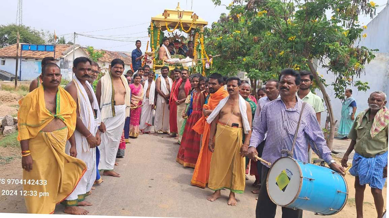 సైదాపూర్, మార్చి 25: సైదాపూర్ మండలంలోని ఎక్లాస్పూర్ గ్రామంలో శ్రీ లక్ష్మి సమేత వెంటేశ్వర స్వామి రథోత్సవం అంగరంగవైభవంగా జరిగింది. వేద పండితుల మంత్రోత్సరణల మద్య స్వామి వారిని రథంపై ప్రతిష్టించి, భక్తులు తాడుతో రథం లాగగా గ్రామంలో స్వామి వారిని ఊరేగించారు. అనంతరం లక్ష్మి సమేత వెంకటేశ్వర స్వామి వారిని గుడికి తీసుకెళ్లారు. అనంతరం పూర్ణాహుతి హోమం నిర్వహించి దేవతలకు చక్ర స్నానం చేయించారు. కార్యక్రమంలో సింగిల్విండో అధ్యక్షుడు కొత్త తిరుపతిరెడ్డి, సింగిల్విండో ఉపాధ్యక్షుడు గుండేటి శ్రీనివాస్, సీఈవో మల్లారెడ్డి, మాజీ సర్పంచ్ కొత్త రాజిరెడ్డి, గ్రామస్తులు వెంకటేశం, రాంరెడ్డి తదితరులు పాల్గొన్నారు.
