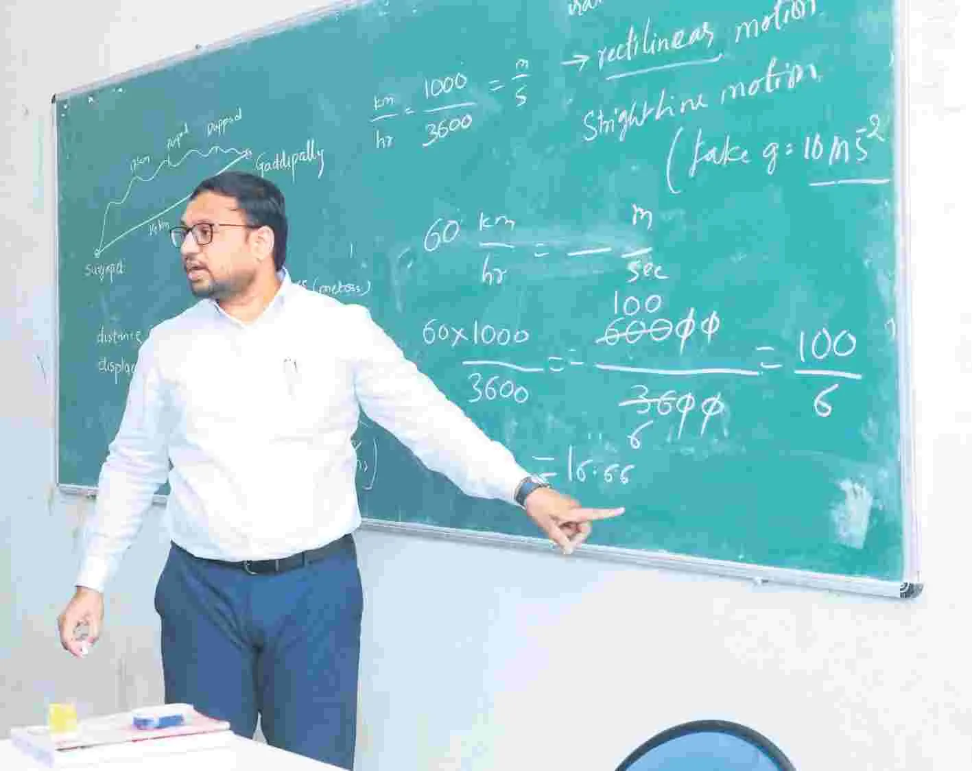 గరిడేపల్లి: గరిడేపల్లి మండలం గడ్డిపల్లి మోడల్ స్కూ ల్, కళాశాలను కలెక్టర్ తేజస్ నందలాల్ పవర్ తనిఖీ చేశా రు. కళాశాలలోని గ్రౌండ్, తరగతి గదులను పరిశీలించారు. అందులో భాగంగా ఇంటర్ ఫస్టియర్ భౌతిక శాస్త్రం బోధిస్తు న్న ఉపాధ్యాయుడు డీ.రవీందర్ నాయక్ భౌతిక శాస్త్రంలోని ఫార్మూలాల గురించి వివరిస్తున్నారు. గమనించిన కలెక్టర్ వెంటనే క్లాస్ రూంలోకి వెళ్లి ఫిజిక్స్లోని ఫార్మూలాల గురిం చి వాటిని ఎలా గుర్తుంచుకోవాలో 35 నిమిషాలు కలెక్టర్ వివరించారు. వేగము, తోరణముపై భౌతిక శాస్త్రంలో ఉన్న పాఠ్యంశాలను విద్యార్థులకు వివరించారు అనంతరం కళాశా ల విద్యార్థులను సమస్యల గురించి అడిగి తెలుసుకున్నారు.