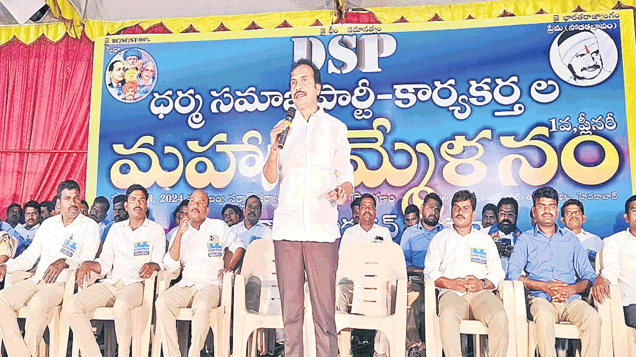ఆదిభట్ల, నవంబరు 3 (ఆంధ్రజ్యోతి) : బీసీ, ఎస్సీ, ఎస్టీ అణగారిన కులాలకు రాజ్యాధికారం సాధించడమే డీఎ్సపీ(ధర్మ సమాజ్ పార్టీ) లక్ష్యమని రాష్ట్ర అఽధ్యక్షుడు డాక్టర్ విశారదన్ మహరాజ్ అన్నారు. ఆదిభట్ల మున్సిపాలిటీ కొంగరకలాన్లోని కల్వకోలు భూపాల్రెడ్డి గార్డెన్లో ఆదివారం పార్టీ రాష్ట్రస్థాయి కార్యకర్తల మహాసమ్మేళనంలో భాగంగా బీసీ ఉద్యమం, విద్య, వైద్యంపై వైజ్ఞానిక అంశాలపై ఒక్క రోజు సదస్సునిర్వహించారు. ఆయా అంశాలపై వక్తలు మాట్లాడారు. అనంతరం డీఎ్సపీ రాష్ట్ర కార్యదర్శి బరిగల దుర్గా ప్రసాద్ అధ్యక్షతన జరిగిన ఈ కార్యక్రమానికి ముఖ్య అతిథిగా విచ్చేసిన విశారదన్మహరాజ్ మాట్లాడుతూ తెలంగాణ ఏర్పాటు లక్ష్యాలు నెరవేరలేదని, పేదలు అణగారిన వర్గాల జీవితాలలో ఏ మార్పు రాలేదన్నారు. 420 హామీలు ఇచ్చి కాంగ్రెస్ పార్టీ అధికారంలోకి వచ్చిందని విమర్శించారు. ఆరు గ్యారెంటీలు అమలు చేయడంలో విఫలమైందన్నారు. సీఎం నియంత పాలన సాగిస్తున్నారని ఆరోపించారు. కాంగ్రెస్ ప్రభుత్వంపై డీఎ్సపీ యుద్ధ ప్రకటిస్తుందని పేర్కొన్నారు. హామీల అమలు కోసం రాష్ట్ర వ్యాప్తంగా 15వేల కిలోమీటర్ల మహా పాదయాత్ర చేపట్టనున్నట్లు ఆయన పేర్కొన్నారు. ఈనెల 5న ఆదిలాబాద్ నుంచి ప్రారంభించే ఈ యాత్ర 2028 వరకు కొనసాగుతుందన్నారు. డీఎ్సపీ అధికారంలోకి వస్తే విద్య, వైద్యం ఉచితంగా అందించడమే కాకుండా.. రాష్ట్ర వ్యాప్తంగా గ్రామాలలో అమెరికాలాంటి ఉన్నత ప్రమాణాలు కలిగిన స్కూళ్లను నిర్మిస్తామన్నారు. ఉమ్మడి ఆంధ్రప్రదేశ్ మాజీ ప్రధాన న్యాయమూర్తి జస్టిస్ ఈశ్వరయ్య మాట్లాడుతూ ప్రజల హక్కులను హరిస్తూ నియతృత్వ పాలన సాగిస్తున్న పాలకులపై న్యాయ, ధర్మ పోరాటం చేయాలన్నారు. ఎస్సీ ఎస్టీ బీసీల వర్గీకరణ అవసరమని, అవి కేంద్ర, రాష్ట్ర ప్రభుత్వాలు సంయుక్తంగా అమలు చేయాలన్నారు. కేవలం రాష్ర్టాలు మాత్రమే చేయాలనడం సుప్రీం కోర్టు చెప్పడం సరికాదన్నారు. కార్యక్రమంలో ఎంవీ ఫౌండేషన్ జాతీయ కన్వీనర్ ఆర్. వెంకట్రెడ్డి, ధర్మ సమాజ్ పార్టీ రాష్ట్ర కార్యదర్శులు దుర్గాప్రసాద్, అన్నెల లక్ష్మణ్, హరీష్ గౌడ్, వినోద్ యాదవ్, రాఘవేంద్ర, రెహమాన్, సుమన్, శ్రీకాంత్, కార్తీక్, రవీందర్ పాల్గొన్నారు.