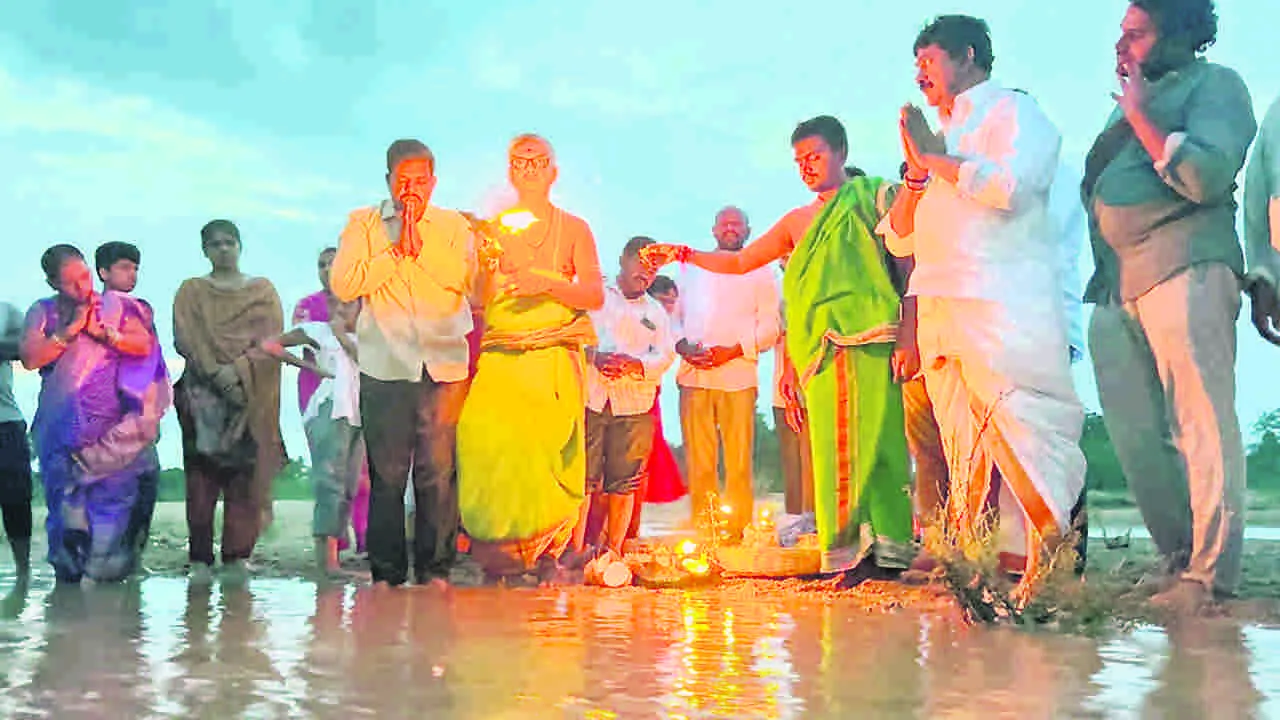 తాడిపత్రి, ఆగస్టు 11(ఆంధ్రజ్యోతి): వర్షాల కారణంగా పెన్నానదికి నీరు రావడంతో బుగ్గరామలింగేశ్వరస్వామి ఆలయం ప్రధాన అర్చకుడు రవిశర్మ, శంకరయ్యశర్మ, గిరి్షశర్మ, బాలానందశర్మ పెన్నానదిలో గంగాహారతి కార్యక్రమాన్ని సోమవారం సాయంత్రం నిర్వహించారు. ఈ కార్యక్రమంలో ఆలయ కమిటీ సభ్యులు చంద్రమోహన, శ్రీనివాసులు, రంగనాథ, చిట్టిబాబు పాల్గొన్నారు.