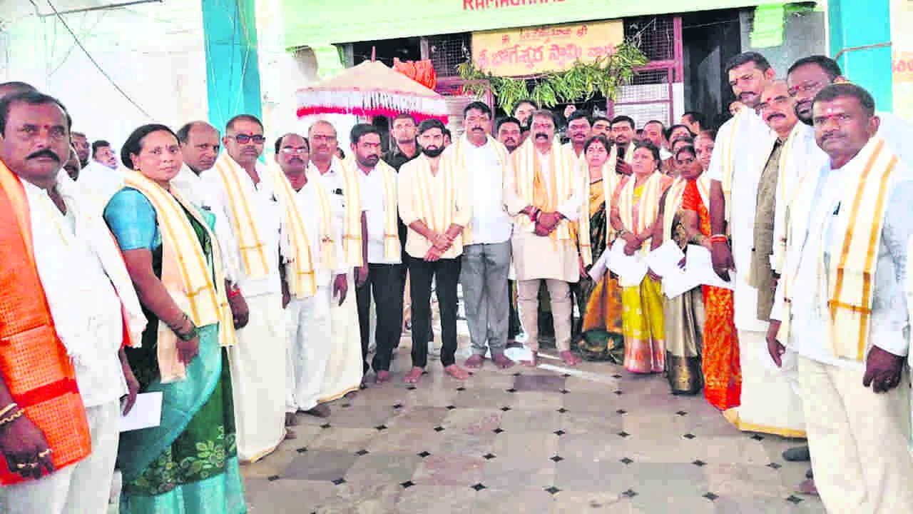 పామిడి, ఆగస్టు 21(ఆంధ్రజ్యోతి): స్థానిక భోగేశ్వరస్వామి, చెన్నకేశవస్వామి ఆలయాల ధర్మకర్తల మండలి ప్రమాణస్వీకారోత్సవం ఎమ్మెల్యే గుమ్మనూరు జయరాం ఆధ్వర్యంలో గురువారం ఘనంగా జరిగింది. ఆలయ కమిటీ చైర్మనగా పోలేపల్లి భారతి, సభ్యులుగా గోరంట్ల జయప్రధ, పసువుల రామలక్ష్మి, నల్లబోతుల లత, పసుపులేటి సురేష్, పెమ్మక స్వామినాథరెడ్డి, వడుగూరు వెంకట రమణ, వడ్డే రామాంజనేయులు, దుస్తఖర్ పవన కుమార్తో ఆలయ ఇనస్పెక్టర్ రాణి, ఈఓ క్రిష్ణయ్య ప్రమాణ స్వీకారం చేయించారు. ఎమ్మెల్యే మాట్లాడుతూ... అన్ని కులాల వారితో కమిటీ వేశామని, ఆలయాల అభివృద్ధికి కృషి చేయాలని సూచించారు.