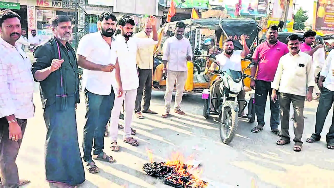 కళ్యాణదుర్గంరూరల్, డిసెంబరు 19(ఆంధ్రజ్యోతి): ఎమ్మెల్యే అమిలినేని సురేంద్రబాబు అధికారులపై ఆగ్రహం వ్యక్తం చేసిన దాన్ని .. జగన పత్రి క వక్రీకరించి ప్రభుత్వంపై తిరుగుబాటు అని తప్పుడు ప్రచారం చేసిందని కురుబ కార్పొరేషన రాష్ట్ర డైరెక్టర్ నీలస్వామి మండిపడ్డారు. ఈ మేరకు శుక్రవారం స్థానిక టీ సర్కిల్ వద్ద జగన పత్రిలను దహనం చేశారు. ఈ పేపర్ ప్రజల పక్షాన కాకుండా మాజీ సీఎం జగన, స్థానిక వైసీపీ సమన్వయకర్త రంగయ్య మెప్పుకోసం వాస్తవాలను కప్పిపుచ్చి తప్పుడు ప్రచారం చేస్తోందని ధ్వజమెత్తారు. ఎమ్మెల్యే అమిలినేని చేస్తున్న అభివృద్ధి ఆ పత్రిక వాళ్లకు కనిపించదని, ఎమ్మెల్యే చేస్తున్న అభివృద్ధిని చూసి వైసీపీ నాయకులు టీడీపీలో చేరుతున్నారని అన్నారు. వైసీపీ ఖాళీ కాకుండా.. అభివృద్ధి చూసి ఓర్వలేకనే జగన పేపర్ ఇటువంటి తప్పుడు రాతలు రాస్తోందని మండిపడ్డారు. కార్యక్రమంలో క్లస్టర్ ఇనఛార్జ్ ఉమే్షగౌడ, పాల్వాయి పంచాయతీ కన్వీనర్ రాజ్కుమార్, ఉద్దీప్ సింహ, జనసేన నాయకులు అనిల్ కుమార్ పాల్గొన్నారు.
