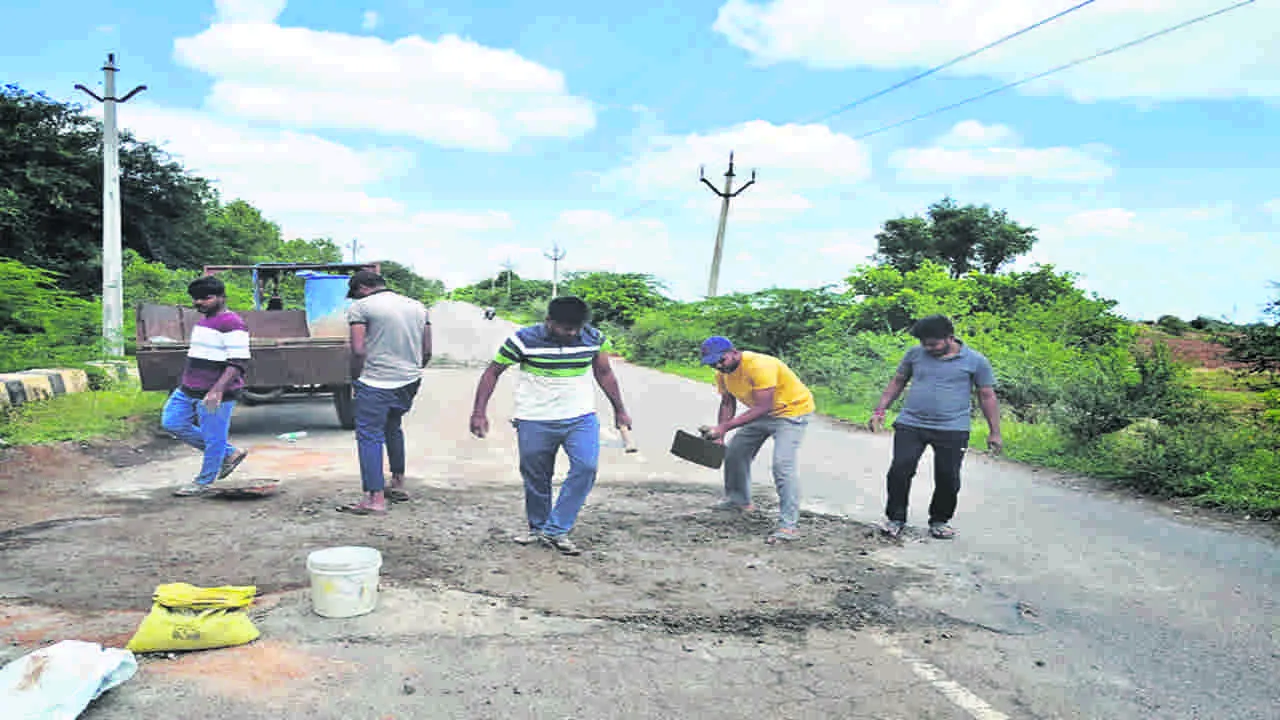 రోడ్డుపై గుంతలు పూడ్చివేత