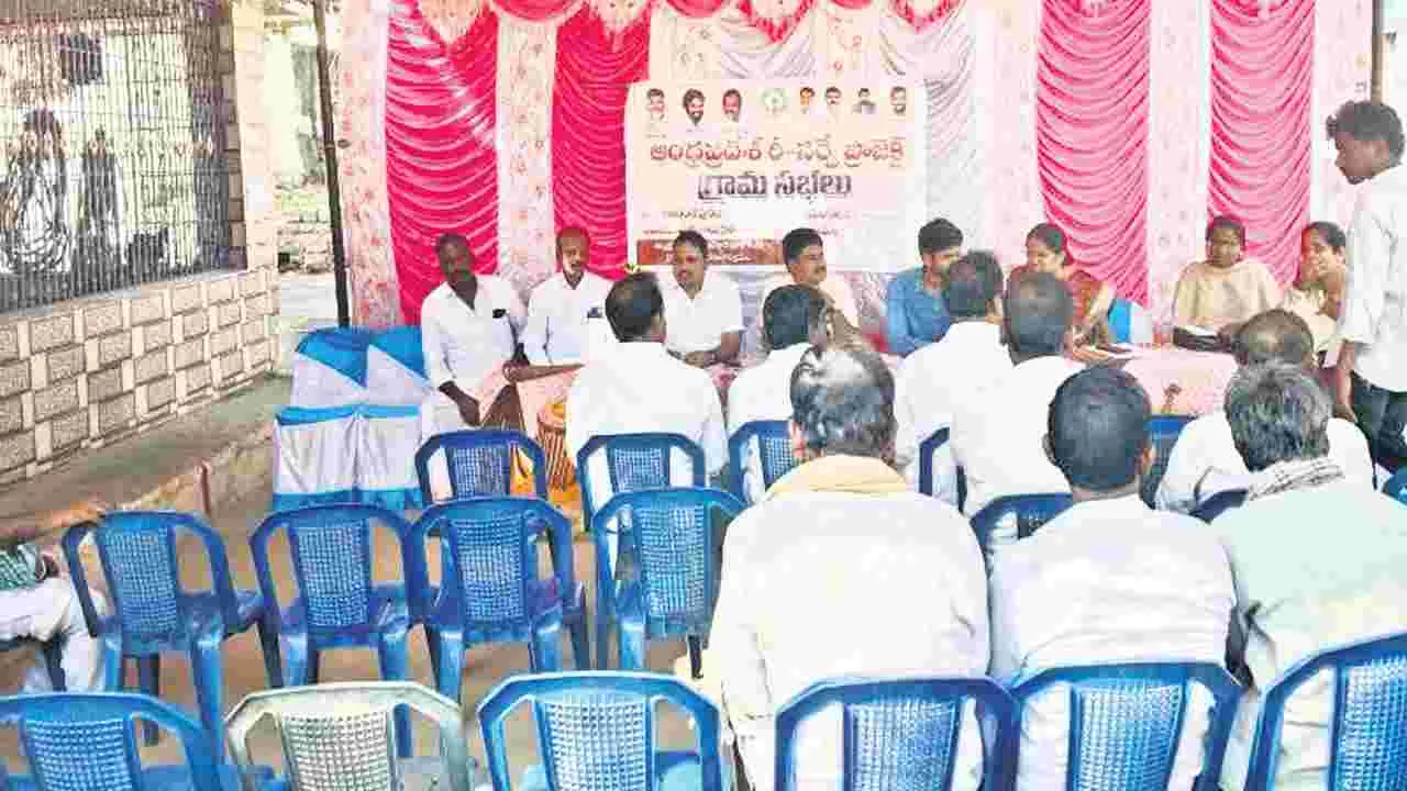 బొమ్మనహాళ్, డిసెంబరు, 26(ఆంధ్రజ్యోతి): మండలంలోని గోవిందవాడ, కలుదేవనహళ్లి గ్రామాల్లో 4వ విడత రీసర్వేపై గ్రామసభలను శుక్రవారం నిర్వహించారు. అయితే గ్రామస్థులకు రెవెన్యూ అధికారులు ఎలాంటి సమాచారం ఇవ్వకపోవడంతో ఈ సభలకు ప్రజలు తక్కువ సంఖ్యలో హాజరయ్యారు. వచ్చిన రైతులకు తహసీల్దార్ మునివేలు, సర్వేయర్ రవితేజ అవగాహన కల్పించారు.