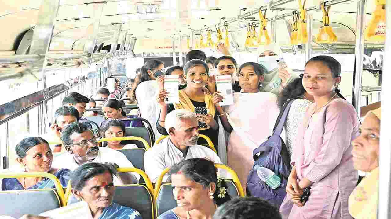 రాష్ట్ర ప్రభుత్వం స్త్రీ శక్తి పథకం ద్వారా ఆర్టీసీలో మహిళలకు ఉచిత ప్రయాణ సౌకర్యం కల్పిస్తూ వారిలో ఆనందకాంతుల్ని నింపుతోంది. రాష్ట్ర ఆర్థికశాఖ మంత్రి జిల్లా కేంద్రంలో శుక్రవారం సాయంత్రం ఉచిత బస్సులను అట్టహాసంగా ప్రారంభించారు. దీంతో శనివారం నుంచి మహిళలతో ఆర్టీసీ బస్సులు కిక్కిరిసిపోతున్నాయి. చేతుల్లో ఆధార్, రేషన కార్డు వంటివి పట్టుకుని కండక్టర్ల వద్ద ఫ్రీ టికెట్లు తీసుకుని బస్సు..