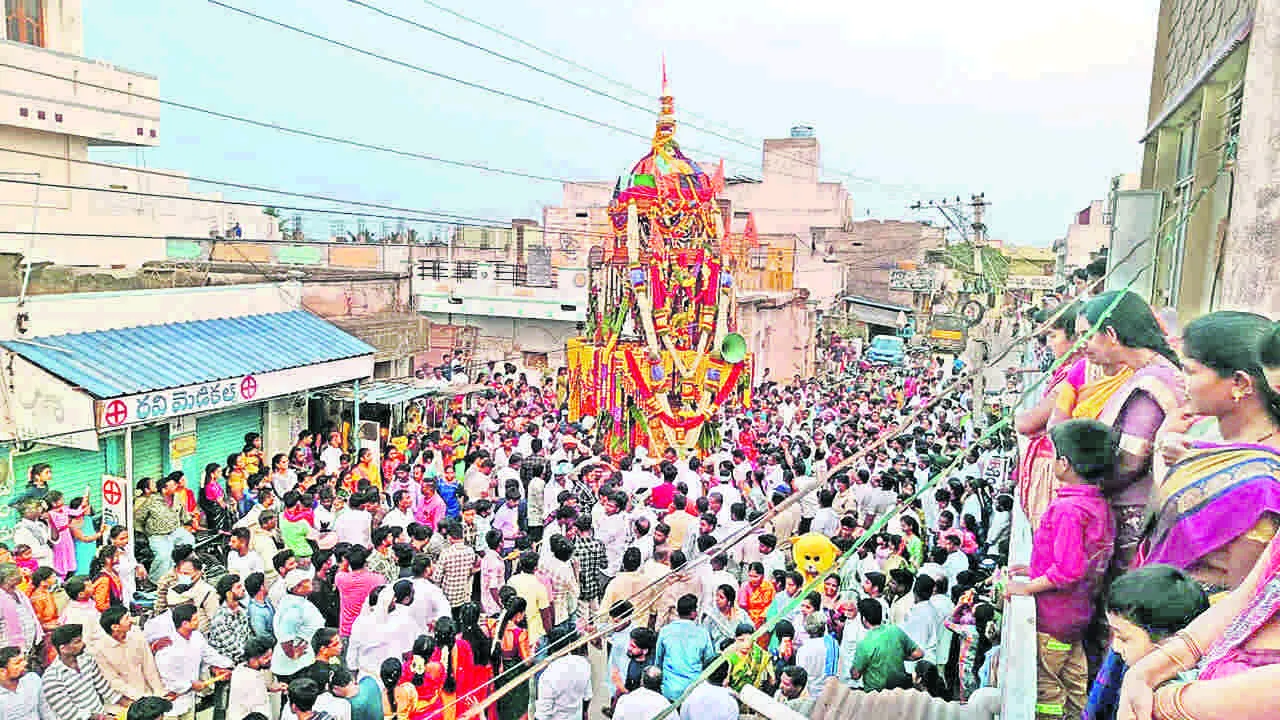 కళ్యాణదుర్గం, ఏప్రిల్ 18(ఆంధ్రజ్యోతి): కంబదూరులో వెలసిన మల్లీశ్వర స్వామి రథోత్సవం అశేష భక్తజనం నడుమ శుక్రవారం వైభవంగా సాగింది. మల్లేశ్వరస్వామి రథోత్సవాన్ని గ్రామంలోని పురవీధుల గుండా ఓం నమఃశివాయ అనే మంత్రంతో భక్తులు గ్రామస్తులు కలసి రథాన్ని లాగారు. స్థానిక పాత బస్టాండు నుంచి పోస్టాఫీసు సర్కిల్ మీదుగా కోటవీధి వరకు మల్లేశ్వరస్వామి రథోత్సవం అత్యంత కన్నుల పండువగా సాగింది. సాయంత్రం 4 గంటల నుంచి 11 గంటల వరకు రథోత్సవాన్ని తిలకించేందుకు స్థానికులే కాకుండా చుట్టుపక్కల గ్రామీణ ప్రాంతాల నుంచి భక్తులు అశేషంగా తరలివచ్చి స్వామివారి సేవలో పాలుపంచుకున్నారు. శనివారం ఉట్లమాను పరుష కూడా అత్యంత వైభవంగా నిర్వహించేందుకు అన్ని ఏర్పాట్లు చేశారు.