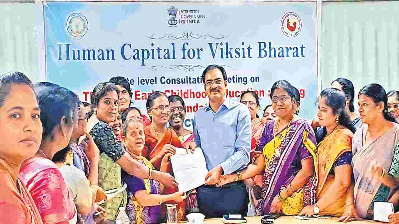 అమరావతి,ఆగస్టు 26(ఆంధ్రజ్యోతి): అంగన్వాడీల సమస్య పరిష్కారంపై ఇప్పటికే రాష్ట్ర ప్రభుత్వం పలు సానుకూల నిర్ణయాలు తీసుకుందని రాష్ట్ర మహిళా, శిశు సంక్షేమశాఖ డైరెక్టర్ వేణుగోపాల్ రెడ్డి చెప్పారు. గ్రాట్యుటీ అమలుకు, మినీ అంగన్వాడీలను మెయిన్ అంగన్వాడీలుగా మార్పునకు ఉత్తర్వులు జారీ చేశామన్నారు. ఇంకా కొన్ని సాంకేతిక సమస్యలు, ఇతర సమస్యలు పరిష్కరిస్తామని తెలిపారు. అంగన్వాడీలకు నెల రోజుల్లో 5జీ నెట్వర్క్తో కొత్త మొబైల్ ఫోన్లు ఇవ్వనున్నట్లు వెల్లడించారు. మంగళవారం గుంటూరులోని తన కార్యాలయంలో అంగన్వాడీ సంఘాల నేతలతో రాష్ట్ర మహిళా, శిశు సంక్షేమశాఖ డైరెక్టర్ వేణుగోపాల్ రెడ్డి భేటీ అయ్యారు. ఈ సమావేశంలో ఏపీ అంగన్వాడీ వర్కర్స్, హెల్పర్స్ యూనియన్, ఏపీ అంగన్వాడీ వర్కర్స్ అసోసియేషన్, ఏపీ ప్రగతిశీల అంగన్వాడీ వర్కర్స్, హెల్పర్స్ యూనియన్ నాయకులు కె సుబ్బరావమ్మ, లలితమ్మ, జ్యోతి భారతి తదితరులు పాల్గొన్నారు. భేటీ అనంతరం ఆ వివరాలతో అంగన్వాడీ సంఘాల నేతలు ఒక ప్రకటన విడుదల చేశారు. వెంటనే అంగన్వాడీల వేతనాలు పెంచాలని, లేకపోతే మరో ఆందోళనకు సిద్ధమవుతామని సమావేశంలో అధికారులకు స్పష్టం చేసినట్లు తెలిపారు. పోషణ ట్రాకర్ యాప్లో నమోదు చేయనవి మాత్రమే బాల సంజీవని యాప్లో చేయాలని డైరెక్టర్ చెప్పారన్నారు. గ్రాట్యుటీ అమలుకు లేబర్ డిపార్ట్మెంట్ సలహాతో గైడ్లైన్స్ రూపొందుతున్నాయని తెలిపారు. 1810 మంది మినీ వర్కర్ల అర్హతకు మినహాయింపు ఇవ్వాలని కోరామన్నారు. వేసవి సెలవులు నెలరోజులు పాటు ఇవ్వడానికి అంగీకారం కుదిరిందన్నారు. జూన్ 2025 వరకు అన్ని రకాల బిల్లులకు బడ్జెట్ ఇచ్చినట్లు తెలిపారన్నారు. పలు జిల్లాల్లో బీఎల్వో డ్యూటీ తప్పించేంచుకు హామీ ఇచ్చారన్నారు.