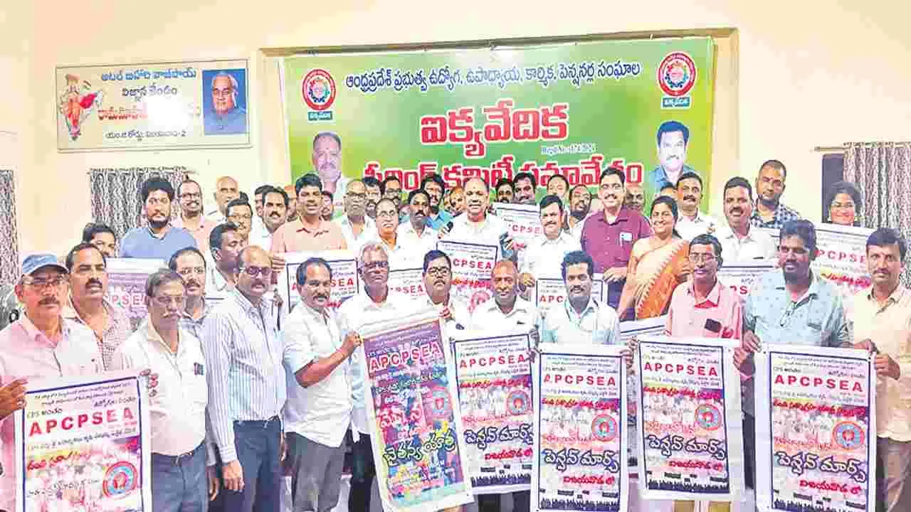 విజయవాడ (వన్టౌన్), జూలై 27 (ఆంధ్రజ్యోతి) : సీపీఎస్ రద్దుచేసి పాత పెన్షన్ పునరుద్ధరించాలని, ఇతర డిమాండ్లతో ఆంధ్రప్రదేశ్ కంట్రిబ్యూటరీ పెన్షన్ స్కీమ్ ఎంప్లాయీస్ అసోసియేషన్ (ఏపీసీపీఎస్ఈఏ) ఆధ్వర్యంలో సెప్టెంబరు 1న ‘వెన్నుపోటు దినం’ పాటించాలని నిర్ణయించారు. విజయవాడలోని బందరురోడ్డులో ఉన్న అటల్ బిహారీ వాజపేయి విజ్ఞాన కేంద్రంలో 47 ఉద్యోగ, ఉపాధ్యాయ, పెన్షనర్ల కాంట్రాక్టు, అవుట్సోర్సింగ్, కార్మిక, కర్షక ఐక్యవేదిక స్టీరింగ్ కమిటీ సమావేశం ఆదివారం జరిగింది. సెప్టెంబరు 1న విజయవాడలో పెన్షన్ మార్చ్ జరపాలని, నల్లచొక్కాలతో హాజరుకావాలని, ఆరోజును వెన్నుపోటు దినంగా పాటించాలని సమావేశంలో నిర్ణయించారు. మహాత్మాగాంధీ దండియాత్ర స్ఫూర్తితో పాదయాత్ర చేయాలని కూడా నిర్ణయించారు. పాదయాత్ర పోస్టర్ను ఐక్యవేదిక చైర్మన్ కేఆర్ సూర్యనారాయణ, ఏపీసీపీఎ్సఈఏ రాష్ట్ర అధ్యక్షుడు, సెక్రటరీ జనరల్ బాజీ పఠాన్ ఆవిష్కరించారు. ఈ సందర్భంగా నాయకులు మాట్లాడుతూ ఆగస్టు ఒకటి నుంచి సెప్టెంబరు ఒకటి వరకు ప్రతి ప్రభుత్వ కార్యాలయంలో, పాఠశాలలో పెన్షన్ మార్చ్కు సంఘీభావం తెలపాలని కోరారు.
