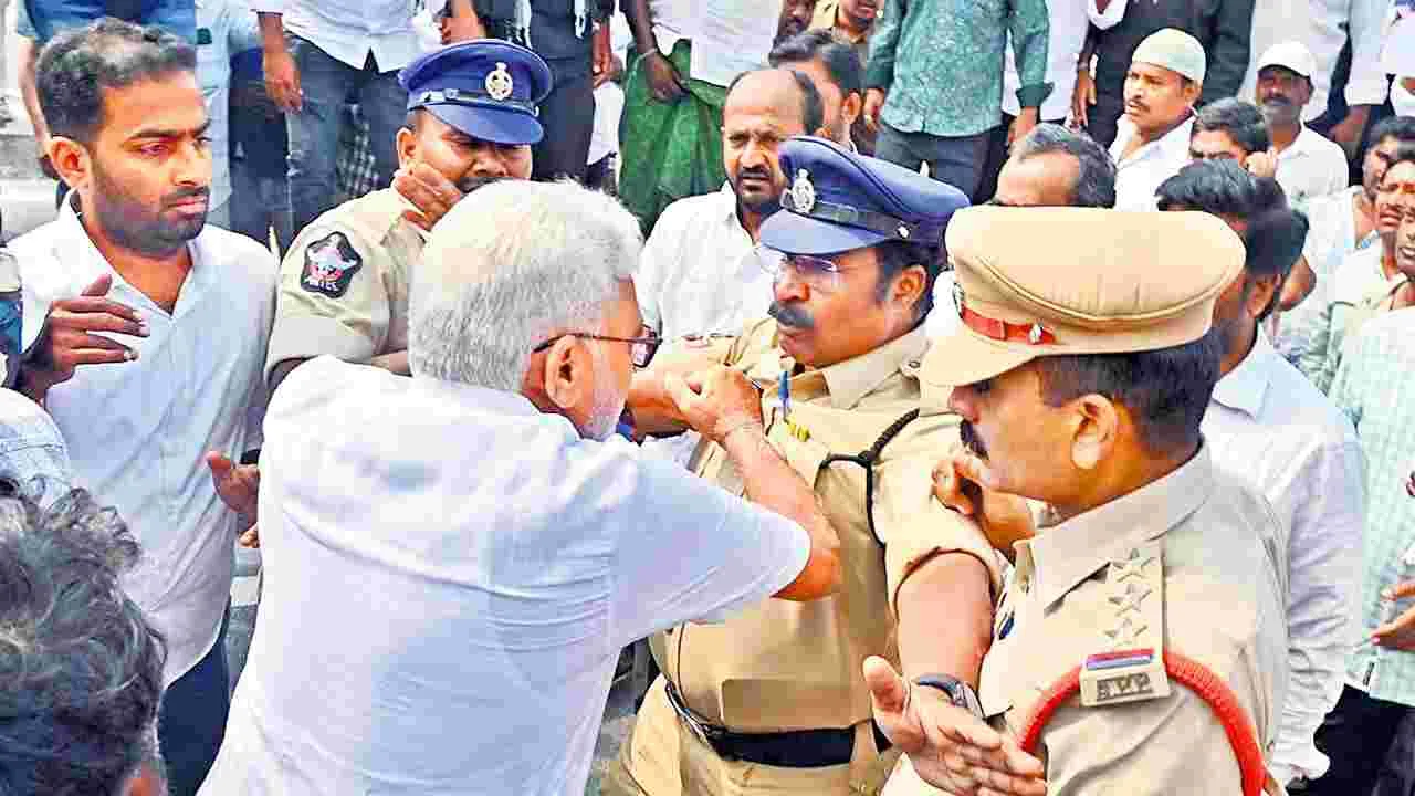 బారికేడ్లు తోసేసి.. కానిస్టేబుళ్లను మోచేత్తో నెట్టేసి దౌర్జన్యం