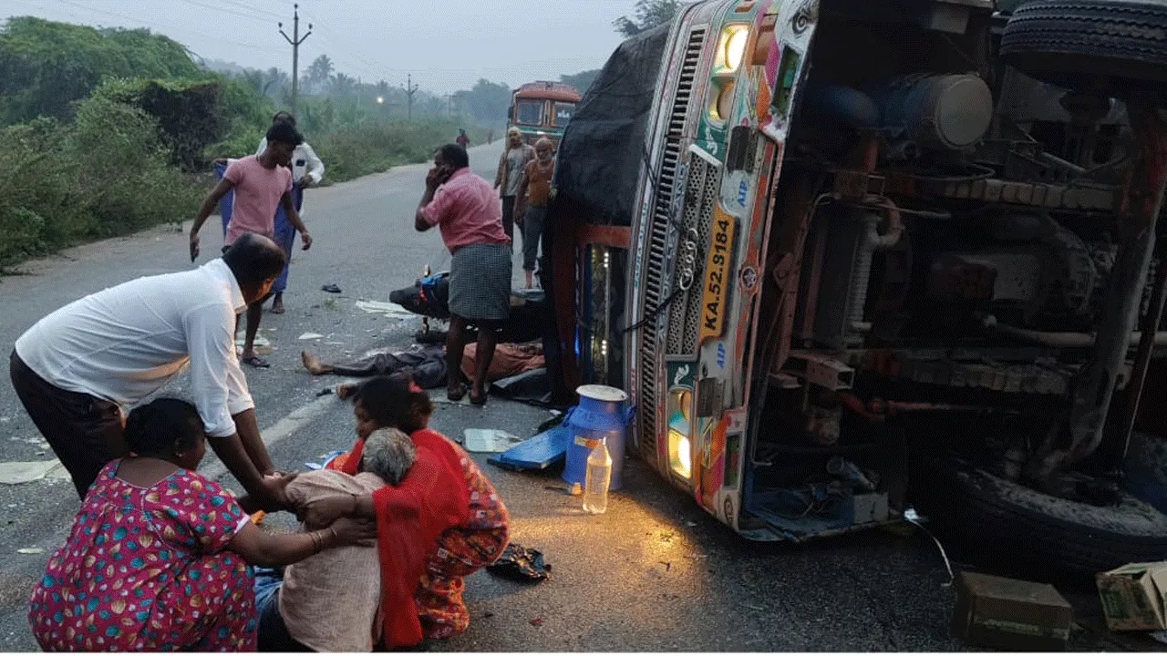 బోల్తా పడ్డ లారీని చూస్తుండగా దూసుకొచ్చిన బస్సు