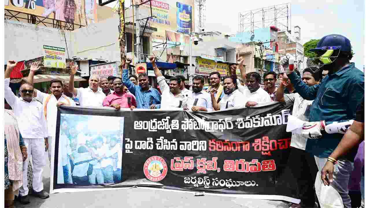 చిత్తూరు జిల్లా బంగారుపాళ్యంలో బుధవారం వైసీపీ అధినేత జగన్ పర్యటన సందర్భంగా ఆంధ్రజ్యోతి ఫొటోగ్రాఫరు శివకుమార్పై ఆ పార్టీ మూకల దాడిని ఖండిస్తూ గురువారం తిరుపతిలో నిరసన గళం వినిపించారు. పోలీసులు నిష్పక్షపాతంగా దర్యాప్తు చేసి దాడి చేసిన వారిని కఠినంగా శిక్షించాలని డిమాండు చేశారు.