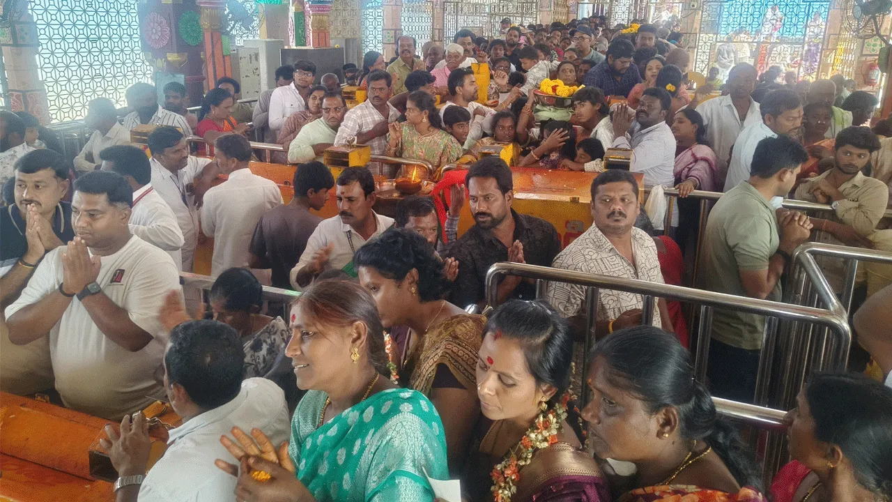 చౌడేపల్లె, డిసెంబరు14(ఆంధ్రజ్యోతి): ప్రముఖ పుణ్యక్షేత్రం బోయకొండ గంగమ్మ ఆలయం ఆదివారం భక్తులతో కిటకిటలాడింది. వేకువజామునే ఆలయ అర్చకులు అమ్మవారిని సుప్రభాత సేవతో మేల్కొలిపి, పంచామృతాలతో అభిషేకాలు చేశారు. స్వర్ణాభరణాలు, పూలతో అలంకరించి, ధూపదీప నైవేద్యాలు సమర్పించారు. భక్తులను దర్శనానికి అనుమతించారు. ఉభయ తెలుగు రాష్ట్రాల నుంచేగాక తమిళనాడు, కర్ణాటక రాష్ట్రాల నుంచి అధిక సంఖ్యలో భక్తులు తరలివచ్చారు. ఉదయం 5 నుంచి మధ్యాహ్నం 3 గంటల వరకు క్యూలలో రద్దీ కొనసాగింది. దాదాపు 20 వేల మంది భక్తులు అమ్మవారిని దర్శించుకుని తీర్థప్రసాదాలు అందుకున్నారు. వివిధ సేవ టికెట్ల ద్వారా రూ.10.50 లక్షల ఆదాయం చేకూరినట్లు అధికారులు తెలిపారు. భక్తులకు ఎలాంటి ఇబ్బందీ లేకుండా ఈవో ఏకాంబరం ఏర్పాట్లను పర్యవేక్షించారు. కాగా వాహనాలు అధిక సంఖ్యలో రావడంతో కొండకు వెళ్లే దారిలో ట్రాఫిక్ స్తంభించింది. దాదాపు మూడు గంటల పాటు భక్తులు ఇబ్బందిపడాల్సి వచ్చింది. గతంలో ఆదివారం రద్దీని దృష్టిలో ఉంచుకుని కొంతమంది ఆలయ సిబ్బందిని నియమించి ట్రాఫిక్ను నియంత్రించేవారు. ప్రస్తుతం ఆ ఏర్పాట్లు లేకపోవడం విమర్శలకు తావిస్తోంది.