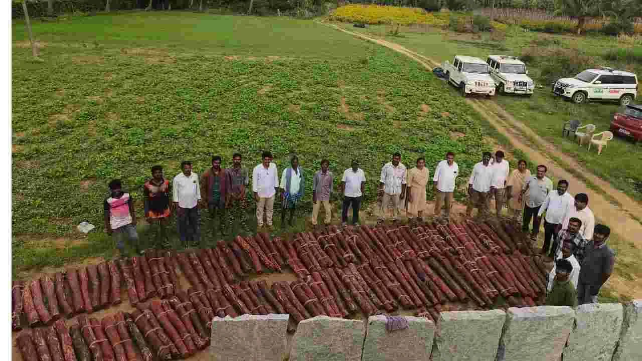 పలమనేరు, ఆగస్టు 11 (ఆంఽధ్రజ్యోతి): ఎర్రచందనం స్టాక్ పాయింట్గా బైరెడ్డిపల్లెను స్మగ్లర్లు వాడుకుంటు న్నట్లు తాజాగా బయటపడింది. తిరుపతి పరిసరాలనుంచి సేకరించిన ఎర్రచందనం దుంగలను బైరెడ్డిపల్లె మండలం మీదుగా కర్ణాటకకు స్మగ్లింగ్ చేస్తున్నట్టు ప్రచారం జరుగుతోంది. ఇందుకు బైరెడ్డిపల్లె మండలానికి చెందిన ఇద్దరు సహకారం అందిస్తున్నట్లు చెబుతున్నారు. కర్ణాటక సరిహద్దులో పలమనేరు రేంజి పరిధిలోని బైరెడ్డిపల్లె మండలం ఆలప్పల్లి కొత్తూరు సమీపంలో పొలం వద్ద ఉన్న ఒక రైతుకు చెందిన ఇంటిలో దాచి వుంచిన రూ.50 లక్షల విలువ చేసే ఎర్రచందనం దుంగలను పట్టుకొన్నట్లు పలమనేరు సబ్ డీఎ్ఫవో వేణుగోపాల్ వెల్లడించారు. తమకు అందిన సమాచారం మేరకు రేంజర్ నారాయణ, సిబ్బందితో కలిసి వెళ్లి దాచి వుంచిన 144 ఎర్రచందనం దుంగలను స్వాధీనం చేసుకొన్నట్లు తెలిపారు.ఎంతో కాలంగా ఎర్రచందనం ఇక్కడ నిల్వచేసి అదను చూసి బెంగళూరు, చెన్నె నగరాలకు రవాణా చేస్తున్నట్లు తెలుస్తోంది. తిరుపతి నుంచి చెన్నె వెళ్లే రహదారులపై పోలీసు, అటవీశాఖ అధికారుల నిఘా ఎక్కువగా వున్నందున స్మగ్లర్లు బైరెడ్డిపల్లె మండలాన్ని స్టాక్ పాయింట్గా ఎంపిక చేసుకోవడంతో పాటు ఇక్కడి ప్రముఖుల సహకారాన్ని కూడా పొందారని అటవీశాఖ అధికారులు అనుమానిస్తున్నారు.గతంలో అక్రమ రవాణాకు పేరుగాంచిన వ్యక్తే ఇక్కడా ముఖ్యుడై వుండవచ్చన్న కోణంలో కూడ అటవీశాఖ అధికారులు దర్యాప్తు చేపడుతున్నట్లు తెలుస్తోంది. బైరెడ్డిపల్లె మండలం అటు కర్ణాటకకు, ఇటు తమిళనాడు సరిహద్దుకు అత్యంత సమీపంలో వుంది. కేవలం ఒక కిలోమీటరు వెళ్తే పొరుగురాష్ట్రాల్లోకి చేరే అవకాశం ఉన్నందున మద్యం, ఇసుక, స్మగ్లర్లకు ఈ మండలం అత్యంత సౌకర్యవంతంగా వుంది. అందువల్లే ఇక్కడకు వచ్చే పోలీసు పోస్టింగ్లకు గట్టిపోటీ వుంటోంది.