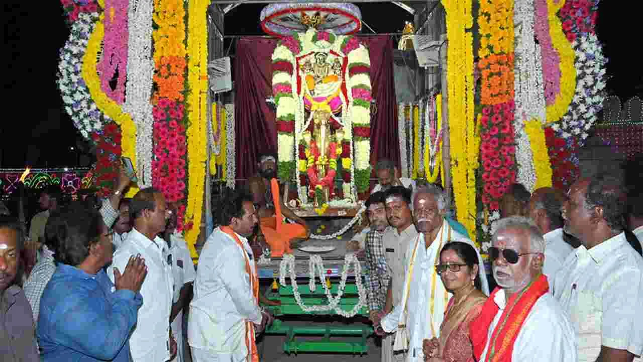 ఐరాల(కాణిపాకం), సెప్టెంబరు 8 (ఆంధ్రజ్యోతి): కాణిపాకంలో నిర్వహిస్తున్న ప్రత్యేక ఉత్సవాల్లో భాగంగా సోమవారం యాళి వాహనంపై వరసిద్ధుడు విహరించాడు. ఈ కార్యక్రమానికి అగరంపల్లెకు చెందిన ఎ.నరసింహారెడ్డి కుమారులు, చినకాంపల్లెకు చెందిన పి.సుబ్బారెడ్డి కుమారులు ఉభయదారులుగా వ్యవహరించారు. ఈ సందర్భంగా ఉదయం మూల విరాట్కు అభిషేకం, చందనాలంకారం చేశారు. ఆలయాన్ని శోభాయమానంగా అలంకరించారు. రాత్రి ఉభయదారులు ఉభయ వరుస తీసుకురావడంతో అలంకార మండపంలో సిద్ధి, బుద్ధి సమేత వినాయకస్వామి ఉత్సవర్లకు పూజలు నిర్వహించారు. అనంతరం ఉత్సవర్లను యాళి వాహనంపై అధిష్ఠింపజేసి, కాణిపాకం పురవీధుల్లో ఊరేగించారు,. ఆలయ ఈవో పెంచలకిషోర్, ఏఈవో రవీంద్రబాబు, సూపరింటెండెంట్లు కోదండపాణి, వాసు, ఇన్స్పెక్టర్లు చిట్టిబాబు, బాలాజీనాయుడు, ఉభయదారులు పాల్గొన్నారు. ప్రత్యేక ఉత్సవాల్లో భాగంగా మంగళవారం సూర్యప్రభ వాహన సేవ జరగనుంది.