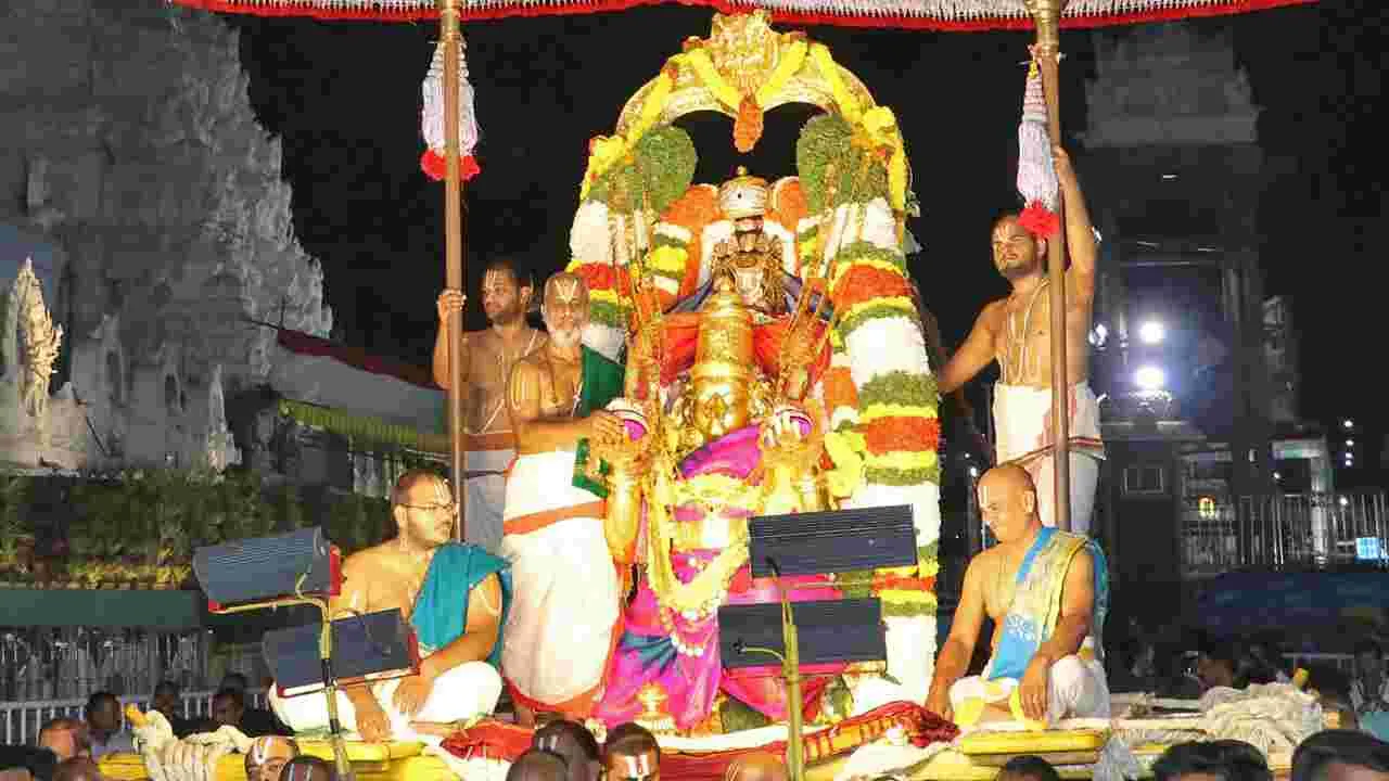 గురుపౌర్ణమి సందర్భంగా తిరుమలలో గురువారం రాత్రి గరుడ వాహనసేవ వైభవంగా జరిగింది. ఆహ్లాదకర వాతావరణంలో తన ఇష్టవాహనమైన గరుడుడిపై సర్వాలంకార భూషితుడై మలయప్ప స్వామి నాలుగు మాడవీధుల్లో ఊరేగి భక్తులకు దర్శనమిచ్చారు. మంగళవాయిద్యాలు, వేదమంత్రాలు, గోవిందనామ స్మరణల మధ్య గరుడుడిపై గోవిందుడు భక్తులను కటాక్షించారు. గురుపౌర్ణమి కావడంతో తిరుమల, తిరుపతి స్థానికులతో పాటు భక్తులు భారీగా మాడవీధుల్లోని గ్యాలరీల్లోకి చేరి కర్పూర నీరాజనాలతో మలయప్పస్వామిని దర్శించుకున్నారు. వాహనసేవలో కేంద్రమంత్రి బండి సంజయ్, జీయర్స్వాములు, బోర్డు సభ్యుడు భానుప్రకా్షరెడ్డి, అదనపుఈవో వెంకయ్య చౌదరి పాల్గొన్నారు.