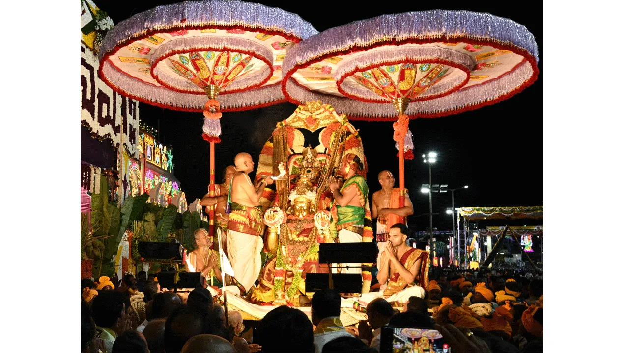 దిగ్గున వెలిగే దీపకాంతులు.. హోరెత్తే గోవిందలు.. గిరిజన నృత్య విన్యాసాలు.. జతగా వాయిద్యాల ఘోష.. ‘ఇటు గరుడని నీవెక్కినను.. పటపట దిక్కులు బగ్గన పగిలె’ అని అన్నమయ్య వర్ణించినట్టుగానే ఆదివారం రాత్రి తిరుమల కొండమీద గరుడోత్సవం సాగింది. మాడవీధులు భక్తజన సముద్రంగా భాసిల్లాయి. లక్ష్మీకాసుల హారం ధరించిన శ్రీనివాసుడు తన ఇష్టవాహనమైన గరుడుడిని అధిరోహించి గజ, వృషభ దళాలు ముందు నడుస్తుండగా మందగమనంతో విహరించాడు. రాత్రి నుంచే చలిని లెక్కచేయకుండా గ్యాలరీ మెట్లనే పడకలుగా మార్చుకున్న భక్తులు.. పగటి ఎండకు దుప్పట్లకింద తలదాచుకుని గరుడుడిపై ఊరేగుతూ వచ్చే స్వామికోసం ఎదురు చూశారు. ప్రకటించిన సమయంకన్నా 23 నిమిషాల ముందే గరుడవాహన సేవ మొదలైంది. ఉండి ఉండీ కురిసే జల్లుల నడుమ మాడవీధుల్లోని లక్షలాది భక్తజనానికి దర్శనమిస్తూ ముందుకు సాగింది.