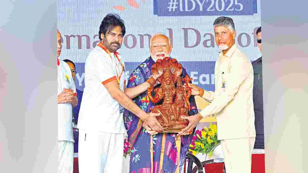 విశాఖపట్నం, జూన్ 21 (ఆంధజ్యోతి): అంతర్జాతీయ యోగా దినోత్సవం విశాఖవేదికగా సూపర్హిట్ అయిందని, ప్రజల సహకారంతో చరిత్ర సృష్టించామని ముఖ్యమంత్రి చంద్రబాబు అన్నారు. యోగాను కామన్వెల్త్, ఏషియన్ గేమ్స్తో పాటు ఒలింపిక్స్లో చేర్చేలా ప్రధాని మోదీ చొరవ తీసుకోవాలని కోరారు. ప్రధానమంత్రి పదేళ్ల కృషి ఫలించిందని, ఏపీలో ఒక్కరోజే 12 లక్షల చోట్ల 2.17 కోట్లమంది యోగాలో భాగస్వామ్యులయ్యారన్నారు. యోగా కొందరిది కాదు.. అందరిదనే భావనను ప్రధాని తీసుకొచ్చారని కొనియాడారు. అందువల్లే ఉదయం 6గంటలకే రావాలని పిలుపునిస్తే...తెల్లవారుజామునే చేరిపోయారని, ప్రకృతి కూడా సహకరించిందన్నారు. మొత్తం 3,03,654 మంది విశాఖలో పాల్గొన్నట్టు క్యూఆర్ కోడ్ స్కాన్ ద్వారా తేలిందని, ఇది గిన్నిస్ రికార్డు అన్నారు. 22,122 మంది గిరిజన విద్యార్థులు 108 నిమిషాలపాటు సూర్య నమస్కారాలు చేయడంతో రెండో రికార్డ్ సొంతమైందన్నారు. దీనికి అదనంగా మరో 21 రికార్డులు సాధించి చరిత్ర సృష్టించామని తెలిపారు.