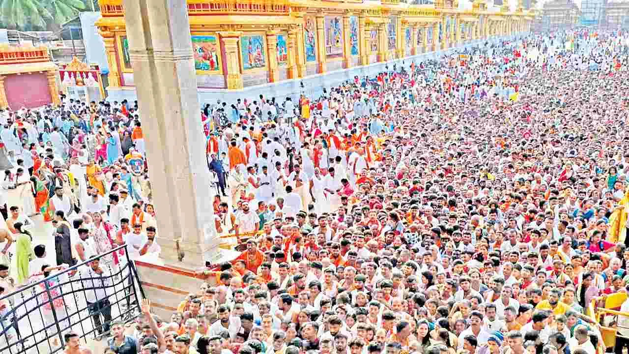 మంత్రాలయం, జూలై 10(ఆంధ్రజ్యోతి): ప్రముఖ ఆధ్యాత్మిక క్షేత్రం మంత్రాలయానికి గురువారం భక్తులు పోటెత్తారు. రాఘవేంద్ర స్వామి దర్శనార్థం లక్ష మందికి పైగా వచ్చిన భక్తులతో మఠం ప్రాంతంతో పాటు మంత్రాలయం పట్టణం రద్దీగా కనిపించింది. గురుపౌర్ణమితో పాటు రాఘవేంద్రస్వామికి ఇష్టమైన గురువారం కావటంతో ఆంధ్ర, తెలంగాణ, కర్ణాటక, మహరాష్ట్ర, తమిళనాడు నుంచి భక్తులు భారీగా తరలివచ్చారు. ఉదయం నుంచి రాత్రి వరకు భక్తుల సంఖ్య పెరుగుతూ వచ్చింది. అన్నపూర్ణ భోజనశాల, మహాముఖద్వారం, మధ్వమార్గ్ కారిడార్, ప్రధాన రహాదారులు, రాఘవేంద్ర సర్కిల్, తుంగభద్ర నది తీరం భక్తులతో కోలాహాలంగా మారింది. తుంగభద్ర నదిలో పుణ్య స్నానాలు ఆచరించి గ్రామదేవత మంచాలమ్మను దర్శించుకొని రాఘవేంద్ర స్వామి మూల బృందావనానికి ప్రత్యేక పూజలు నిర్వహించి మొక్కులు తీర్చుకున్నారు. మఠం అధికారులు రద్దీని దృష్టిలో ఉంచుకుని ప్రత్యేక ఏర్పాట్లు చేశారు.