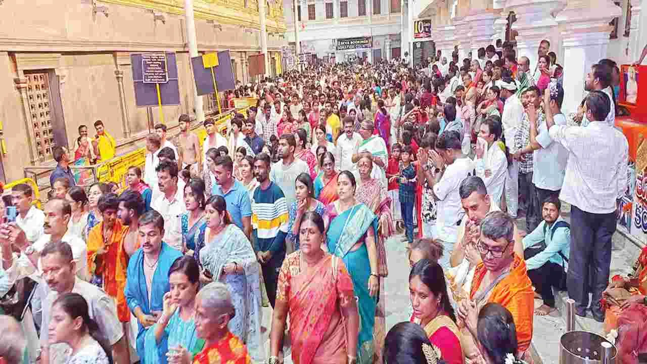 మంత్రాలయం, ఏప్రిల్ 18(ఆంధ్రజ్యోతి): రాఘవేంద్ర స్వామి దర్శనార్థం వచ్చిన భక్తులతో మంత్రాలయం సందడి గా మారింది. శుక్రవారం సెలవు దినం కావటంతో వేలాది మంది భక్తులు తరలివచ్చారు. దీంతో మఠం ప్రాంగణం భక్తులతో కిక్కిరిసింది. అన్నపూర్ణ భోజనశాల, మహాముఖద్వారం, మధ్వమార్గ్ కారిడార్, ప్రధాన రహదారులు, రాఘవేంద్ర సర్కిల్, తుంగభద్ర నది తీరం భక్తులతో కోలాహాలంగా మారింది. తుంగభద్ర నదిలో పుణ్య స్నానాలు ఆచరించి గ్రామదేవత మంచాలమ్మను దర్శించుకొని రాఘవేంద్ర స్వామి మూల బృందావనానికి ప్రత్యేక పూజలు నిర్వహించి మొక్కులు తీర్చుకున్నారు.