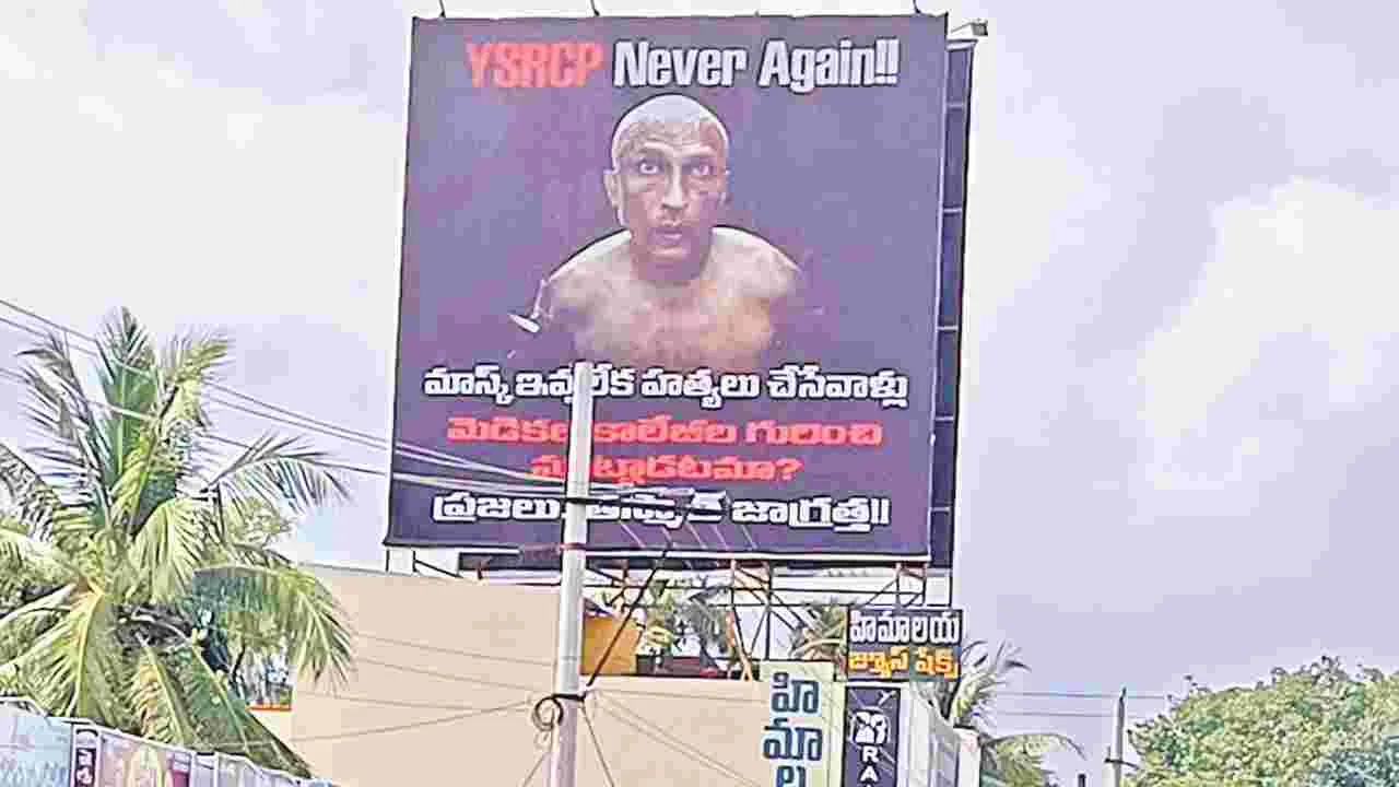 నర్సీపట్నం, అక్టోబరు 9(ఆంధ్రజ్యోతి): మాజీ సీఎం జగన్ పర్యటన నేపథ్యంలో నర్సీపట్నంలో డాక్టర్ సుధాకర్ ఫొటోతో ఫ్లెక్సీలు వెలిశాయి. పట్టణంలోని పలు కూడళ్లలో గుర్తుతెలియని వ్యక్తులు వీటిని ఏర్పాటుచేశారు. కరోనా సమయంలో డాక్టర్ సుధాకర్ నర్సీపట్నం ఆస్పత్రిలో ఎన్-95 మాస్క్ల కొరతపై ప్రభుత్వాన్ని నిలదీశారు. దీంతో ఆయన్ను సస్పెండ్ చేశారు. ఆ తర్వాత విశాఖలో రోడ్డుపై ఆయన్ను పోలీసులు అదుపులోకి తీసుకుని చేతులు వెనక్కి విరిచి, ఆటోలో కేజీహెచ్కు, అక్కడ నుంచి మానసిక వైద్యశాలకు తరలించిన ఘటన రాష్ట్రవ్యాప్తంగా సంచలనం రేపింది. ఈ ఉదంతంపై సీబీఐ విచారణ కోరుతూ హైకోర్టులో వంగలపూడి అనిత అప్పట్లో పిల్ వేశారు. కేసు విచారణలో ఉండగానే డాక్టర్ సుధాకర్ మరణించారు. గురువారం మాకవరపాలెంలో అసంపూర్తిగా ఉన్న మెడికల్ కళాశాల భవనాల పరిశీలనకు జగన్ వస్తున్న నేపథ్యంలో డాక్టర్ సుధాకర్ ఫొటోతో ఫ్లెక్సీలు వెలిశాయి. ‘వైఎస్సార్సీపీ నెవర్ ఎగైన్.. మాస్క్లు ఇవ్వలేక హత్యలు చేసేవాళ్లు మెడికల్ కాలేజీల గురించి మాట్లాడటమా?, ప్రజలారా తస్మాత్ జాగ్రత్త’ అనివాటిపై ముద్రించారు.