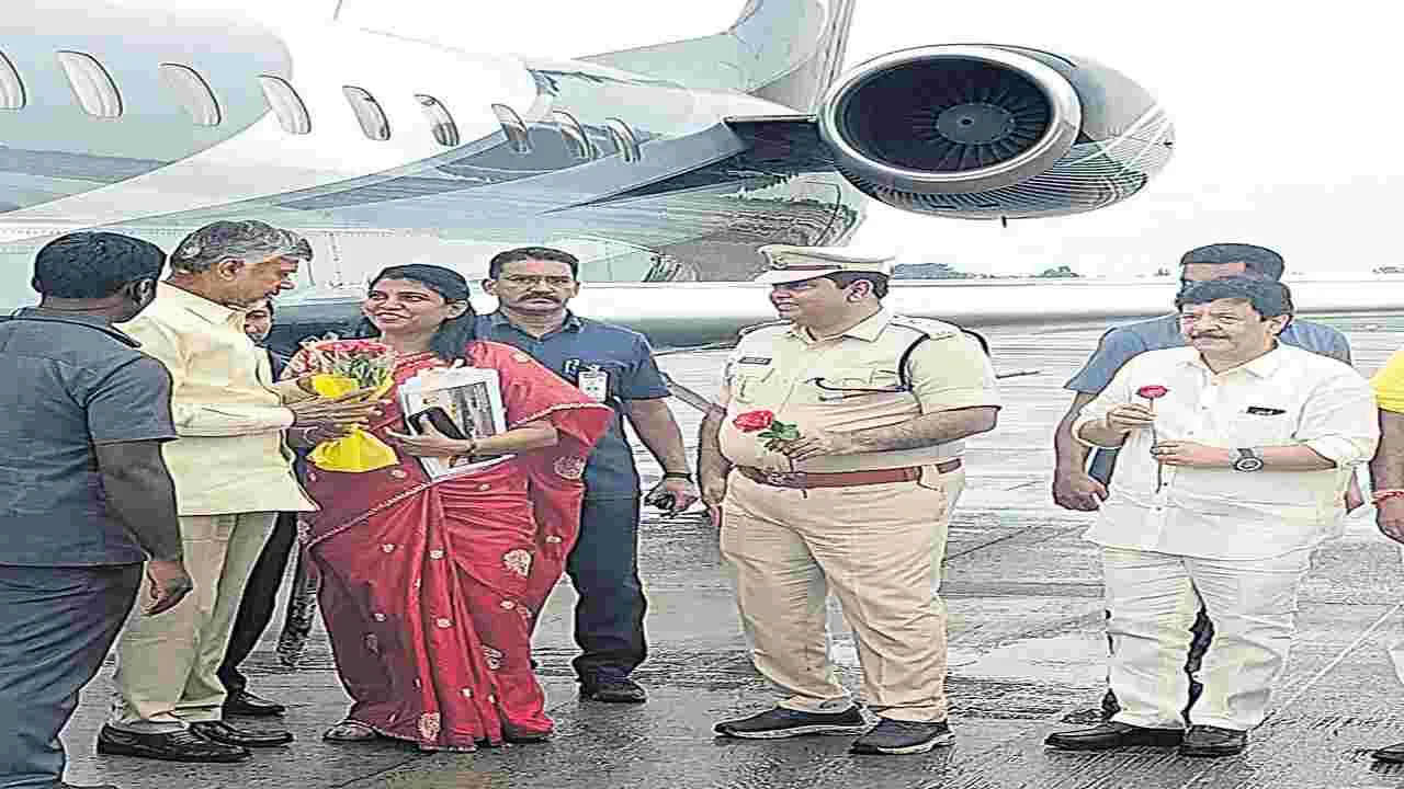 తాళ్లపూడి మండలం మలకపల్లిలో ఎన్టీఆర్ భరోసా పింఛన్లు పంపిణీ చేసేం దుకు జిల్లా పర్యటకు వచ్చిన సీఎం చంద్రబాబుకు మధురపూడి ఎయిర్పోర్టులో మంత్రులు, ఎమ్మెల్యేలు, జిల్లా అఽధికారులు ఘనంగా స్వాగ తం పలికారు. నేరుగా మలకపల్లి సమీపంలో ఏర్పాటు చేసిన హెలిప్యాడ్కు హెలికాప్టర్లో సీఎం చంద్రబాబు చేరుకోవాల్సి ఉండగా వాతా వరణం బాగోక పోవడంతో ప్రత్యేక విమానం లో మధురపూడి ఎయిర్పోర్టుకు చేరుకున్నారు.