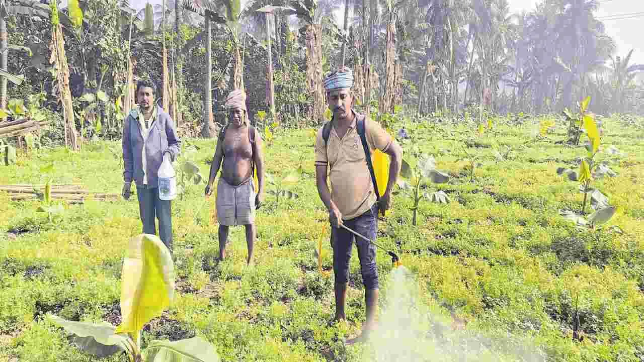 పంటను తీసేసేందుకు కలుపు మందు కొడుతున్న రైతన్నలు