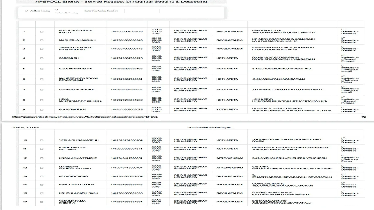 ఆత్రేయపురం, ఆగస్టు 5 (ఆంధ్ర జ్యోతి): చనిపోయిన ఓ వ్యక్తి పేరు మీద 17 విద్యుత్ కనెక్షన్లు ఉన్న ట్టుగా ఆన్లైన్లో చూపించడంతో ప్రభుత్వ పథకాలు పొందేందుకు ఆ కుటుంబ సభ్యులు అర్హత కోల్పో గా విద్యుత్శాఖ అధికారుల నిర్లక్ష్యం తేటతెల్లమైంది. డాక్టర్ బీఆర్ అంబే డ్కర్ కోనసీమ జిల్లా ఆ