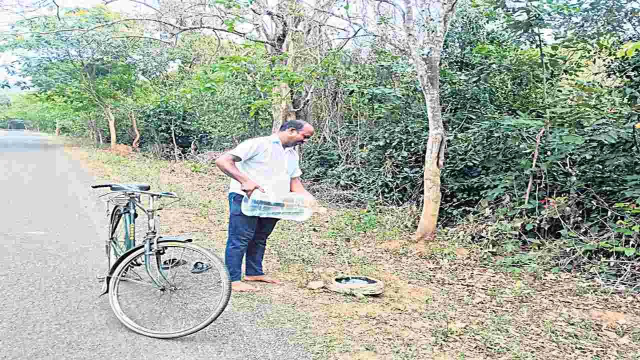 కొద్ది రోజులు గా సూర్యుడు భగభగలాడుతున్నాడు. ఉదయం 10గంటల నుంచి సాయంత్రం 5గంటల వరకు ఎండ వేడిమిని మనుషులు, మూగ జీవాలు తట్టుకోలేకపోతున్నాయి. ముఖ్యంగా పశుపక్ష్యాదులు తాగునీటి కోసం అలమటిస్తున్నాయి. ఎంత దూరమైన వెళ్లి దప్పిక తీర్చుకునే ప్రయత్నం చేస్తున్నాయి. తాగునీటి కోసం మూగజీవాలు చేస్తున్న అన్వేషణను కళ్లారా చూసి చలించిపో యిన ఓ చిరుద్యోగి వాటి దప్పిక తీర్చేందుకు తనవంతు సహకారం చేస్తున్నాడు.