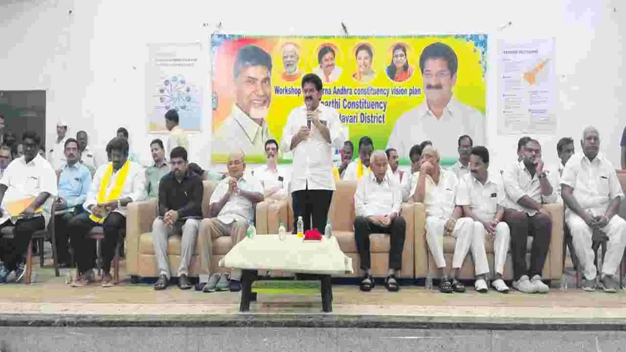భావి తరాలకు చక్కని మార్గాన్ని ఏర్పాటు చేయడమే లక్ష్యంగా సీఎం చంద్రబాబు విజన్ 2047 రూ పొందించారని ఎమ్మెల్యే నల్లమిల్లి రామకృష్ణారెడ్డి అన్నారు. శుక్రవారం అనపర్తిలోని ఎస్ఎన్ ఆర్ కళ్యాణ మండపంలో ఏర్పాటు చేసిన ని యోజకవర్గ స్థాయి వర్క్షాపునకు ఆయన వి చ్చేసి మాట్లాడారు. నియోజకవర్గంలో ఉన్న సమస్యలను అధిగమించేందుకు చేపట్టాల్సిన కార్యక్రమాలపై మేధావి వర్గాలు సూచనలు సలహాలు అందజేయాలన్నారు.