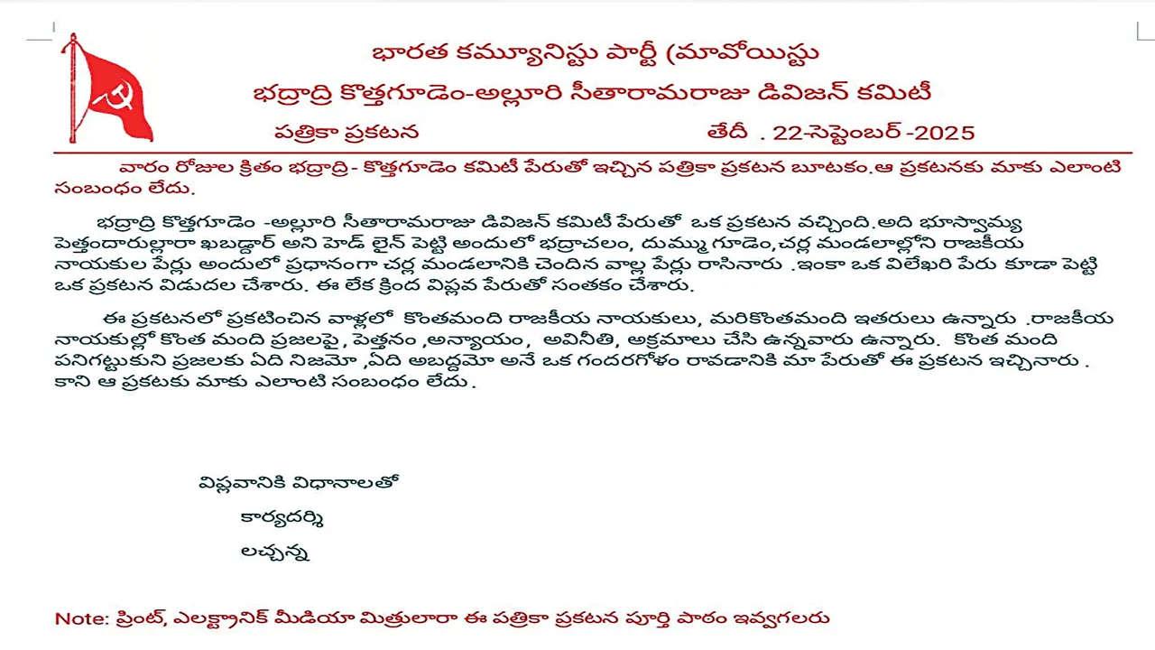 చింతూరు, సెప్టెంబరు 22 (ఆంధ్రజ్యోతి): ఛత్తీస్గఢ్ సరిహద్దులో ఇటీవల మావోయిస్టుల పార్టీ పేరిట విడుదలైన లేఖతో తమకు ఎటు వంటి సంబంధం లేదని మావోయిస్టు పార్టీ డివిజన్ కమిటీ కార్యదర్శి లచ్చన్న సోమవారం ఖండించారు. ఆయన మాట్లాడుతూ ఇటీవల భద్రాద్రి కొత్తగూడెం-అల్లూరి సీతారామ