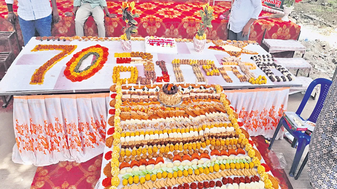 సినీ నటుడు చిరంజీవి పుట్టినరోజు 70వ పుట్టినరోజు సందర్భంగా కోనసీమ జిల్లా మామిడికుదురు మండలం అప్పనపల్లిలో 140 కిలోలతో 70 రకాల స్వీట్లతో మెగాస్టార్ అని రాసి అభిమానులు శుభాకాంక్షలు తెలిపారు.