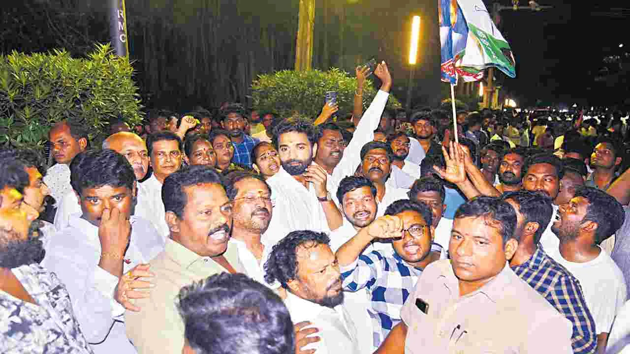 రాజమహేంద్రవరం, జూలై 20 (ఆంధ్రజ్యోతి) : లిక్కర్ స్కామ్ కేసులో ఎ4, వైసీపీ ఎంపీ మిథున్రెడ్డిని ఆదివారం రాత్రి రాజమండ్రి సెంట్రల్ జైలుకు తరలించారు. విజయ వాడ ఏసీబీ కోర్టు మిథున్రెడ్డికి ఆగస్టు 1వ తేదీ వరకూ రిమాండ్ విధించడంతో సిట్ టీమ్ డీజీ రాజశేఖర్ ఆధ్వర్యంలో ఆదివారం రాత్రి 8.38 గంటలకు రాజమండ్రి సెంట్రల్ జైలుకు తీసుకొచ్చారు.జక్కంపూడి గణేష్, కొందరు యువకు లు వైసీపీ జెండాలతో వచ్చి సెంట్రల్ జైలు ఎదురుగా రోడ్డుపై సుమా రు 2 గంటల పాటు బైఠాయించి హంగామా సృష్టిం చారు.పోలీసులు ముందుగా కట్టుదిట్టమైన ఏర్పాట్లు చేయకపోవడంతో నేరుగా జైలు గేటు వరకూ వైసీపీ కార్య కర్తలు, నేతలు వచ్చారు. దీంతో పోలీసులు అప్రమత్తమై సెంట్రల్ జైల్ రోడ్ అటూ ఇటూ బ్లాక్ చేశారు. ఇన్చార్జి ఎస్పీ మురళీకృష్ణ నాయకత్వంలో అడిషనల్ ఎస్పీలు సుబ్బరాజు, చెంచురెడ్డి, ముగ్గురు డీఎస్పీలు, పలువురు సీఐలు, ఎస్ఐలు, సుమా రు 60 మంది పోలీసులు అక్కడ మోహరించారు. నిఘా విభాగాలు రంగంలోకి దిగాయి. రోప్ పార్టీ వచ్చింది. సెంట్రల్ జైలు వద్ద సెక్షన్ 30 అమల్లో ఉందని.. రోడ్డుపై ఎవరూ ఉండవద్దని హెచ్చ రించారు. ఎమ్మెల్సీలు తలశిల రఘురామ్, అప్పిరెడ్డి సెంట్రల్ జైలు ప్రధాన గేట్ వద్దకు వెళ్లే ప్రయత్నం చేయడంతో పోలీ సులు అడ్డుకు న్నారు.దీంతో కాసేపు వాగ్వాదం జరిగింది. అడిషనల్ ఎస్పీ మురళీకృష్ణ వారిద్దరినీ బయటకు పంపించారు. మాజీ మంత్రి చెల్లుబోయిన వేణు, మాజీ ఎంపీ మార్గాని భరత్రామ్,మాజీ ఎమ్మెల్యేలు చిర్ల జగ్గిరెడ్డి, తలారి వెంకట్రావు, సత్తి సూర్యనారాయణ రెడ్డి, గూడూరి శ్రీనివాస్ తదితరులు సెంట్రల్ జైలు వద్దకు వచ్చారు. ముందుగా పెద్ద హడావుడి చేసిన వైసీపీ శ్రేణులు మిఽథున్రెడ్డిని తీసుకొచ్చిన సమయంలో కిక్కురుమనక పోవడం గమనార్హం. జైలు అధికారులు వైసీపీ నేతలను ఎవరినీ లోపలకు అనుమతించ లేదు. జైలు అధికారులు లాంఛనాలు పూర్తిచేసి ఎంపీ మిథున్రెడ్డిని సెంట్రల్ జైలు రిమాండ్లో ఉంచారు.