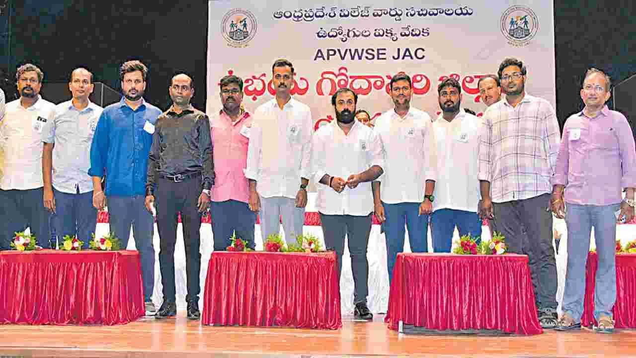 రాజమహేంద్రవరం, అక్టోబరు 5 (ఆంధ్ర జ్యోతి) : వలంటీర్ల విధుల నుంచి సచివా లయ ఉద్యోగులకు విముక్తి కలిగించకపోతే ఉద్యమం తీవ్రతరం చేస్తామని రాష్ట్ర సచివా లయ ఉద్యోగుల ఐక్యవేదిక రాష్ట్ర చైర్మన్ ఎండీ జానీ పాషా, సెక్రటరీ జనరల్ విప్పర్తి నిఖిల్ కృష్ణ,కన్వీనర్ షేక్ అబ్దుల్ రజాక్ హెచ్చరిం చారు.రాజమహేంద్రవరం ఆనం కళా కేం ద్రంలో ఆదివారం జరిగిన ఆంధ్రప్రదేశ్ గ్రామ, వార్డు సచివాలయాల ఉద్యోగుల ఐక్యవేదిక ఉమ్మడి ఉభయగోదావరి జిల్లాల ప్రాంతీయ సమావేశంలో మాట్లాడారు. ఉద్యోగులకు నోష నల్ ఇంకిమ్రెంట్లు ఇవ్వాలని, వలంటీర్ విధుల నుంచి విముక్తి కల్పిం చాలని, ఆరే ళ్లుగా ఒకే క్యాడర్లో పనిచేస్తున్నందున ఆటోమేటిక్ అడ్వాన్స్ స్కీమ్ ద్వారా స్పెషల్ ఇంక్రిమెంట్లు మంజూరు చేయాలని, రికార్డు అసిస్టెంట్ పేస్కేల్తో క్యాడర్ అప్ గ్రేడ్ చేయాలని డిమాండ్ చేశారు. సమావేశంలో నాయకులు బత్తుల అంకమ్మరావు, యువ షణ్ముఖ, కేవీ.రాజేష్బాబు, వి.భార్గవ్ సుతేజ్, ఎస్కె.మహమూబ్,జీవీఎస్ శ్రీనివాస్, కె.షాలెం, కృష్ణ వెస్లీ, ఆళ్ల శ్రీధర్రెడ్డి, బి.రోజా ప్రకాష్, ఎస్.నాగేశ్వరరావు, ఎస్కె మహబూబా సు భానీ, దడాల జగ్గారావు, నవకోటి జయకృష్ణ తదితరులు పాల్గొన్నారు.