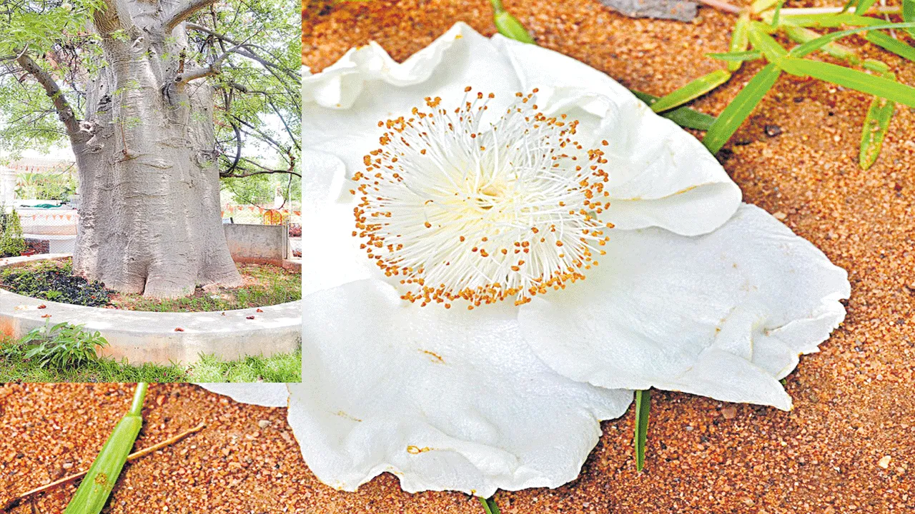 రాజమహేంద్రవరం సిటీ, జూన్ 20( ఆంధ్రజ్యోతి): తూర్పుగోదావరి జిల్లా రాజమహే ంద్రవరం నగరపాలక సంస్థ ఆవరణంలో ఉన్న సుమారు 500 ఏళ్లనాటి సౌత్ ఆఫిక్రా దేశానికి చెందిన బూరుగుజాతీ మహావృక్షం (అడన్ సోనియా డిజిటేటా) పుష్పించింది. ఎన్నో తరాలను చూసిన ఈ మహావృక్షం పువ్వులు కూడా తెల్లకలువ పువ్వూలను పోలిఉన్నాయి. ఈ మహావృక్షం కొమ్మల నుంచి కిందకు లాంతరు బుడ్డి మాదిరిగా వేలాడుతూ విచిత్రంగా కనిపించాయి. వాటి మొగ్గలు కూడా కాయలు మాదిరిగా కనిపించాయి. రాజమహేంద్రవరం సామ్రాజ్యంలో ముస్లిం వర్తకులు వా పారం రీత్యా ఇక్కడికి వచ్చినప్పుడు సౌత్ ఆఫ్రికా నుంచి ఈ మహావృక్షం మొక్కను తెచ్చి అప్పటి కోట గోడ సమీపంలో నాటడంతో అది పెరిగి మహావృక్షంగా మారి నాటి చరిత్రకు ఆనవాలుగా నిలిచింది. ఈ పుష్పం పరిక్వత చెందాక వచ్చే కాయలు చింతకాయలు మాదిరిగా పుల్లగా ఉంటాయని, వాటిని విరోచనాలకు మందుగా వినియోగిస్తారని నాటు వైద్యు లు చెబుతున్నారు. ఇదే వృక్షాలు సౌత్ ఆఫిక్రాలో సు మారు రెండు వేల ఆడుగుల ఎత్తు పెరిగి అక్కడ ప్రజలకు నివాసాలుగా కూడా ఉప యోగపడుతుంటాయి. సు మారు 10 తరాలను చూసిన ఈ వృక్షాన్ని రక్షించుకోవాల్సిన బాధ్యత నగరపాలక సంస్థ అధికారులతో పాటు అటవీ శాఖ అధికారులపై కూడా ఉంది.