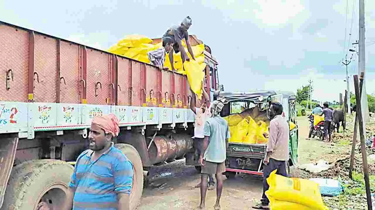 పిఠాపురం/గొల్లప్రోలు రూరల్, సెప్టెంబరు 18 (ఆంధ్రజ్యోతి): యూరియాపై ప్రభుత్వం, అధికా రులు ఎంత నిఘా ఉంచినా అక్రమ మార్గాల్లో తరలిపోతోంది. ఇతర ప్రాంతాల నుంచి యూరియాను లారీల్లో తెచ్చి బ్లాక్మార్కెట్కు తరలించి బస్తాపై అదనంగా రూ.400-500 వరకూ సొమ్ము చేసుకుంటున్నారు. కొందరు ఎరువుల డీలర్లు గ్రా మాల్లోకి నేరుగా లారీలు తెచ్చి విక్రయాలు సాగిస్తున్నారు.గొల్లప్రోలు మండలం తాటిపర్తి, వన్నె పూడి గ్రామాల్లో యూరియా అధిక ధరలకు విక్రయిస్తున్నారని, షాపులకు రావాల్సిన నిల్వలు పక్కదోవ పట్టిస్తున్నారని అందిన ఫిర్యాదులపై విజిలెన్స్ సీఐ ఐ.గోపాలకృష్ణ, వ్యవసాయశాఖ ఏడీ పి.స్వాతి, గొల్లప్రోలు మండల వ్యవసాయాధికారి కేవీవీ సత్యనారాయణ తనిఖీలు చేపట్టా రు. తాటిపర్తి గ్రామ శివారులో వన్నెపూడి రోడ్డు లో యూరియా లోడుతో రెండు లారీలను గుర్తించి విచారణ చేపట్టారు. డాక్టర్ బీఆర్ అం బేద్కర్ కోనసీమ జిల్లా మండపేట మండలం ద్వారపూడి రైల్వే ర్యాక్ నుంచి 450 బస్తాల ఎన్ఎఫ్ఎల్ యూరియా తాటిపర్తి నాగదుర్గా ఏజన్సీస్కు లారీలో తెచ్చారు. అయితే షాపు నిర్వాహకుడు సదరు లారీని షాపు వద్దకు రానివ్వకుండా వేరే ప్రాంతంలో నిలపమని చెప్పి ఆటోలు, మోటార్ సైకిళ్ల ద్వారా 127 బస్తాల యూరియా తరలించినట్టు లారీ డ్రైవ ర్ తెలిపారు. మరో లారీలో 450 బస్తాల యూరియాను ద్వారపూడి రైల్వే వేగన్ నుంచి తాటిపర్తిలోనే నాగదుర్గా ఏజన్సీస్తోపాటు దుర్గా సరస్వతి ట్రేడర్స్కు తీసుకువచ్చారు. ఇం దులో 225 బస్తాల వంతున రెండు షాపులకు తీసుకోవాలని చెప్పారని లారీ డ్రైవర్ తెలిపారు. నాగదుర్గా ఏజన్సీస్కు వచ్చిన స్టాకును వన్నెపూడిలో రోడ్డుపై నిలిపి రూ.400 వం తున విక్రయించినట్టు అధికారుల విచారణలో వెల్లడైంది. తాటిపర్తి డీలర్లకు ఈ స్టాకు హోల్సేల్ డీలర్లుగా ఉన్న సామర్లకోట మండలం పెదబ్రహ్మదేవం లక్ష్మీ కల్యాణి ఎంటర్ప్రైజెస్, ఉప్పలగుప్తం మండలం భీమనపల్లి గ్రామానికి చెందిన లక్ష్మీనారాయణ ఏజన్సీస్ నుంచి పంపినట్టు గుర్తించారు. యూరియా అక్రమ రవాణా, బ్లాక్మార్కెట్ చేసి అధిక ధరలకు విక్రయిస్తున్నట్టు గుర్తించి రెండు లారీలతోపాటు 548 బస్తాల యూరియా స్వాధీనం చేసుకున్నారు. వీరు తనిఖీలు చేస్తున్న సమయంలోనే ఈ పోస్ మిషన్ ద్వారా నాగదుర్గా ఏజన్సీస్ ప్రతినిధి రైతుల వేలిముద్రలు తీసుకునేందుకు ప్రయత్నిస్తుండగా సదరు మిషన్ను సైతం సీజ్ చేశారు. వీటిని గొల్లప్రోలు పోలీసులకు అప్పగించారు. విజిలెన్స్, వ్యవసాయాధికారుల తనిఖీలు గురువారం తెల్లవారుజామున నాలుగు గంటల వరకూ కొనసాగాయి.
