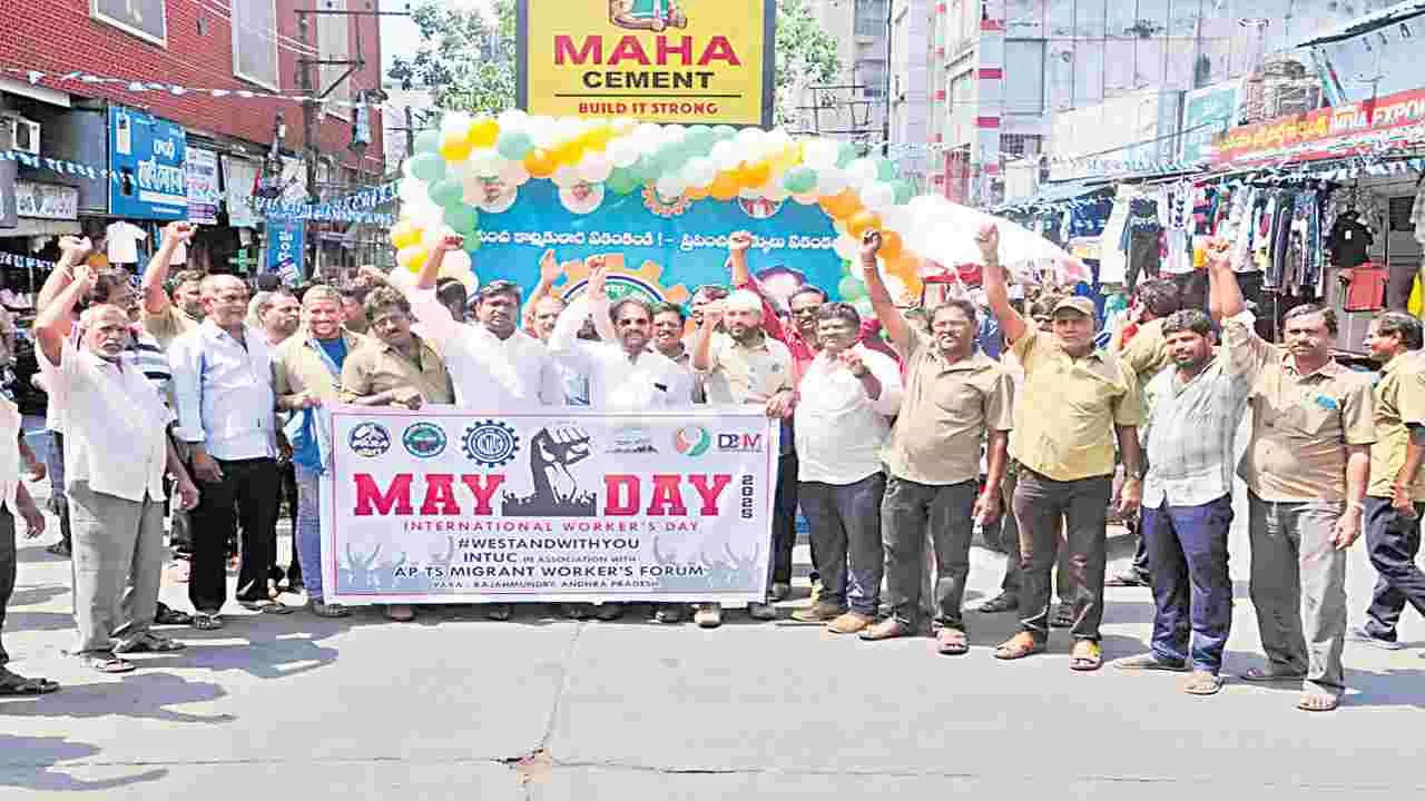 కొవ్వూరు, మే 1 (ఆంధ్రజ్యోతి): కార్మిక చట్టాలపై ప్రతిఒక్కరికి అవగాహన ఉండాలని కొవ్వూ రు 9వ అదనపు జిల్లా జడ్జి అన్నారు. ప్రపంచ కార్మిక దినోత్సవం(మే డే)ను పలుచోట్ల గురువారం వివిధ కార్మిక సంఘాల ఆధ్వర్యంలో ఘనంగా నిర్వహించారు. ఈ సందర్భంగా కొవ్వూ రు బస్టాండ్ సెంటర్లోని భవన నిర్మాణ కార్మికులకు మండల లీగల్ సెల్ సర్వీసెస్ కమిటీ ఆధ్వర్యంలో న్యాయవిజ్ఞాన సదస్సు నిర్వహించారు. కార్మికులకు ముందుగా అదనపు జిల్లా జడ్జి అనురాధ శుభాకాంక్షలు తెలియజేశారు. అనంత రం మాట్లాడుతూ తాను కూడా 2008 మే 1న జ్యూడీషియల్ సర్వీసెస్లోకి రావడానికి ప్రమా ణం చేసి వచ్చానన్నారు. కార్మికులు శారీరకం గాను, ఉద్యోగులు మానసికంగాను కష్టపడతారన్నారు. ఏదేమైనప్పటికీ అందరం ప్రపంచ పునః నిర్మాణానికి ఎవరి స్థాయిలో వారు సాయం అందజేస్తున్నారన్నారు. ఈ నెల 1 నుంచి వారం రోజుల పాటు న్యాయసేవలు, కార్మికుల హక్కు లు, కార్మిక చట్టాలపై అవగాహన సదస్సులు నిర్వహించనున్నట్టు చెప్పారు. కార్యక్రమంలో న్యాయవాదులు ఎస్వీ మునీంద్ర, ఎన్బీ కాంతిదర్, ఎం.శ్రీవల్లీ, లేబర్ ఆఫీసర్ సులోచన, నిర్మాణ రంగ కార్మికులు పాల్గొన్నారు. మండలంలోని విజ్జేశ్వరం సెంటర్లో విజయదుర్గ భవన నిర్మాణ కార్మిక సంఘం అధ్యక్షుడు కొమ్మన రాముడు, కార్యదర్శి మారెళ్ల శ్రీను జెండా ఆవిష్కరించారు. వాడపల్లిలో గోదావరి గట్టుపై శ్రీకృష్ణ చైతన్య తాపీ వర్కర్స్ యూనియన్ అధ్యక్షుడు వీరా త్రిమూర్తులు, అయినవిల్లి డేవిడ్ జెండా ఆవిష్కరించి మే డే వేడుకలు నిర్వహించారు. శ్రీనివాసపురంలో వినాయక కనస్ట్రక్షన్ వర్కర్స్ యూనియన్ నాయకులు వల్లేపు రాంబాబు, పోతురాజు, కోరమండల్ స్లీపర్ కంపెనీ వద్ద యూనియన్ కార్యదర్శి బీరా రవి, టి.పాపారాయుడు, పుంతలో ముసలమ్మ ఆలయం వద్ద సాయి గణేష్ పెయింటర్స్ యూనియన్ ఆధ్వ ర్యంలో గోసాల శ్రీను, సిద్దిరెడ్డి బాపిరాజు, బాపూజీ, కూరగాయల మా ర్కెట్ వద్ద బజారు జట్టు వర్కర్స్ యూనియన్ నాయకులు ఎం.వీరబాబు, కె.కనకారావు, బుద్ధుడి విగ్రహం వద్ద హమాలీ కార్మికుడు సాజిపల్లి పెంట య్య, బస్టాండ్ సెంటర్ చైతన్య తాపీవర్కర్స్ యూనియన్ కార్యాలయం వద్ద మైగాపుల నాగేశ్వరరావు, బస్టాండ్ గ్యారేజ్ వద్ద సీఐటీయూ జిల్లా అధ్యక్షుడు ఎం.సుందరబాబు జెండా ఆవి ష్కరించారు. అనంతరం పట్టణంలోని అల్లూరి సీతారామరాజు విగ్ర హం నుంచి బస్టాండ్ వరకు ర్యాలీ చేపట్టారు. అక్కడ మద్దుకూరి దొరయ్య అధ్యక్షతన కార్మికుల సభ నిర్వహించారు. సుందరబాబు మాట్లాడుతూ కేంద్ర ప్రభుత్వం రాజ్యాంగబద్ధంగా ఉన్న కార్మిక చట్టాలను విస్మరించి కార్పొరేట్లకు, పెట్టుబడిదార్లకు అనుకూలంగా తీసుకువచ్చిన లేబర్కోడ్లను రద్దు చేసే వరకు కార్మికులంతా ఐక్య గా ఉద్య మించాలని పేర్కొన్నారు. కార్యక్రమానికి విచ్