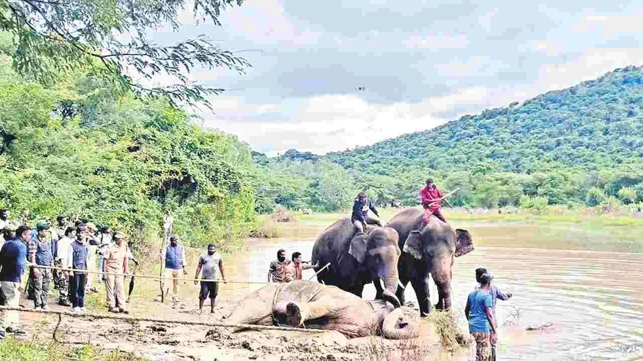యాదమరి, నవంబరు 30 (ఆంధ్రజ్యోతి): వారం రోజుల క్రితం తమిళనాడు నుంచి చిత్తూరు జిల్లాలోకి ప్రవేశించిన ఓ ఏనుగు.. యాదమరి మండలం తెల్లరాళ్లపల్లె పంచాయతీ డీకే చెరువు అటవీ ప్రాంతంలోని నీటికుంటలో కాలు విరిగి కదల్లేని స్థితిలో పడి ఉంది. అటవీ శాఖ అధికారులు దీన్ని తిరుపతిలోని ఎస్వీ జూ పార్కుకు తరలించే ఏర్పాట్లు చేస్తున్నారు. ఈ ఏనుగు వారం క్రితం తమిళనాడు నుంచి సరిహద్దు ప్రాంతమైన యాదమరి మండలంలోని కమ్మపల్లె అటవీ బీట్లోకి ప్రవేశించింది. కాలుజారి పడటంతో కుడికాలు తొడభాగంలో ఎముక విరిగింది. అలాగే తిరుగుతూ శనివారం రాత్రి డీకే చెరువు సమీపంలోని గుడ్డివాని చెరువు వద్దకు వచ్చి బురదలో ఇరుక్కుంది. ఆదివారం స్థానికుల సమాచారంతో అటవీశాఖ అధికారులు వచ్చి పరిశీలించారు. పలమనేరు సమీపంలోని ముసలిమడుగు నుంచి రెండు కుంకీ (కృష్ణ, అభిమన్యు)లను రప్పించి మధ్యాహ్నం మూడు గంటల నుంచి సహాయక చర్యలు చేపట్టారు. చెరువు నుంచి దీన్ని బయటకు తీశాక తిరుపతిలోని ఎస్వీ జూ పార్కుకు తరలిస్తామని అనంతపురం సర్కిల్ సీసీఎఫ్ యశోదాబాయి తెలిపారు.