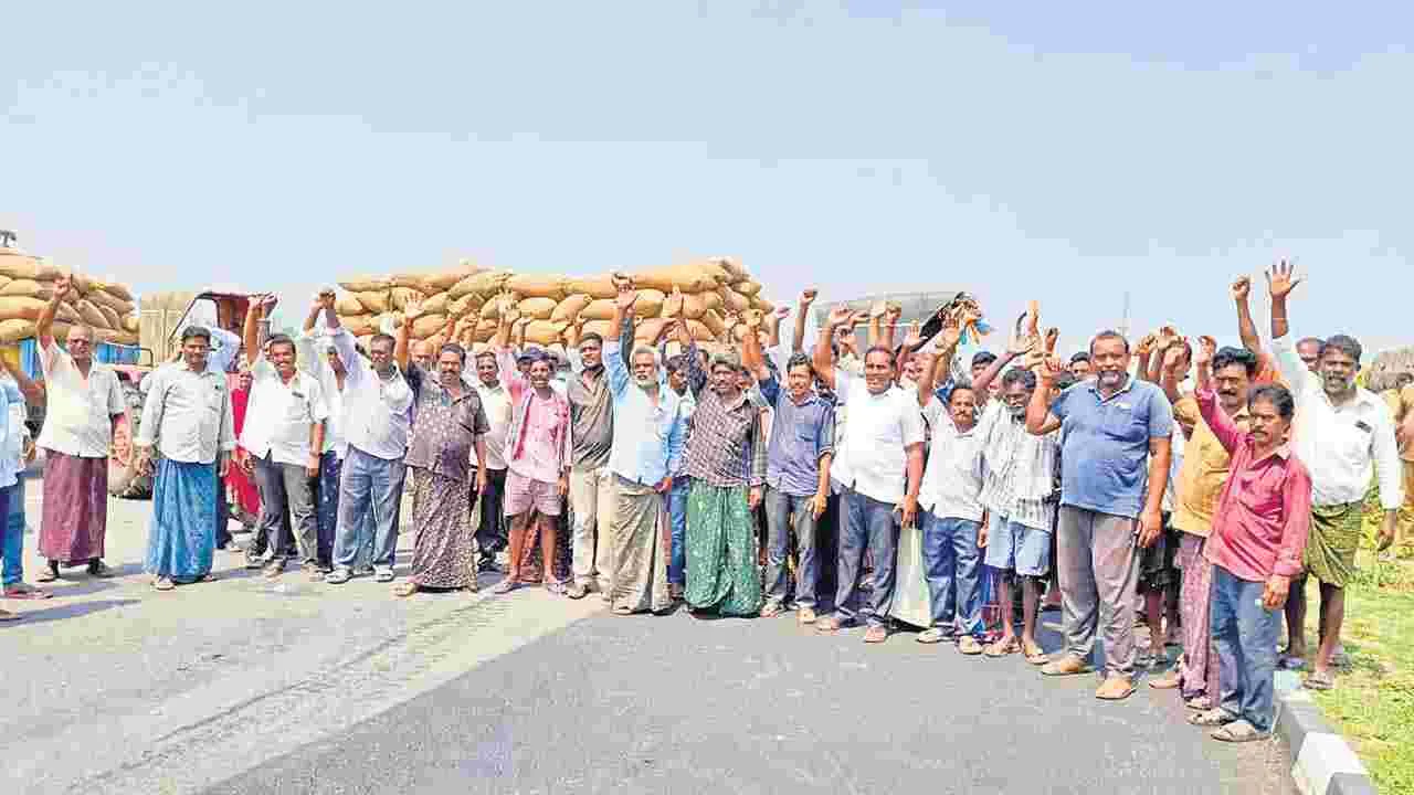కొవ్వూరు, మే 12 (ఆంధ్రజ్యోతి): ‘‘రైతు సేవా కేంద్రా (ఆర్ఎ్సకే)ల్లో కొనుగోళ్ల లక్ష్యం పూర్తయిపోయిందంటూ సిబ్బంది ధాన్యం తీసుకోవడంలేదు. మరి పండించిన పంటను ఏం చేయాలి..? ప్రభుత్వం ప్రకటించిన విధంగా పండించిన ప్రతి గింజనూ కొనుగోలు చేయాల్సిందే. అప్పటిదాకా ఆందోళన విరమించేది లేదు..’’ అంటూ తూర్పుగోదావరి జిల్లా కొవ్వూరు, చాగల్లు మండలాల రైతులు సోమవారం రోడ్డెక్కారు. కొవ్వూరు, గుండుగొలను జాతీయ రహదారిపై గామన్ బ్రిడ్జి టోల్ప్లాజా సమీపంలో ధాన్యం ట్రాక్టర్లను అడ్డంగా పెట్టి ఆందోళన చేపట్టారు. ఎండను సైతం లెక్క చేయకుండా సుమారు రెండున్నర గంటల పాటు జాతీయ రహదారిని దిగ్బంధం చేశారు. పంట మొత్తం కొనుగోలు చేస్తామని జేసీ, ఆర్డీవోలు హామీ ఇవ్వాలని డిమాండ్ చేశారు. భారీగా ట్రాఫిక్ నిలిచిపోవడంతో పోలీసులు, తహసీల్దార్, వ్యవసాయ శాఖ అధికారులు అక్కడికి చేరుకుని రైతులతో మాట్లాడారు. రోడ్డుకు అడ్డంగా పెట్టిన ధాన్యం ట్రాక్టర్లను తొలగించి ట్రాఫిక్ క్లియరెన్స్కు సహకరించాలని కోరారు. పోలీసులు రైతులను బలవంతంగా తరలించే ప్రయత్నం చేశారు. అయినా వారు తమ సమస్య పరిష్కారమయ్యే వరకు ఆందోళన విరమించేది లేదని పట్టుబట్టారు. అదే సమయంలో అటుగా వెళ్తున్న సివిల్ సప్లయిస్ కార్పొరేషన్ చైర్మన్ తోట సుధీర్ రైతులను చూసి కారు దిగి వచ్చి విషయం తెలుసుకున్నారు. ఈ సందర్భంగా ఆయన మాట్లాడుతూ.. రైతులు పండించిన ప్రతి గింజనూ ప్రభుత్వం కొనుగోలు చేస్తుందని.. ఆందోళన చెందనవసరం లేదని చెప్పారు. దీంతో రైతులు ఆందోళన విరమించారు.