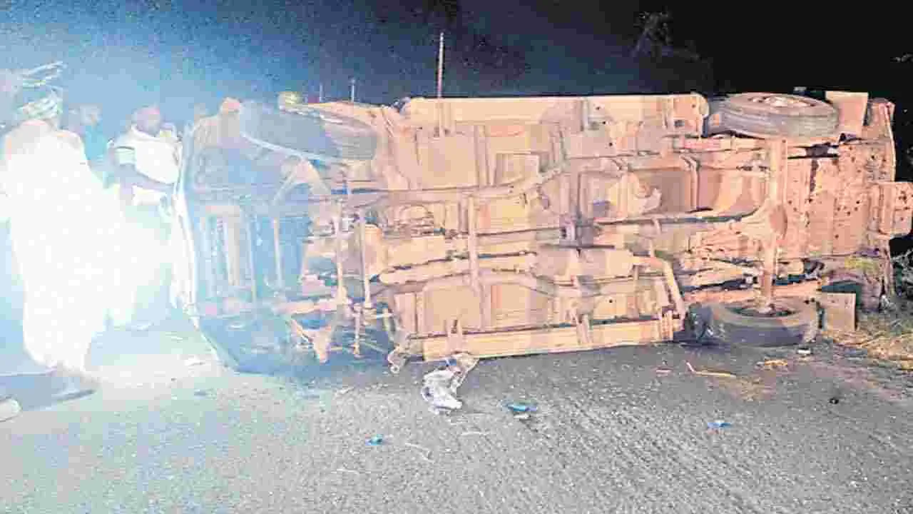 యాక్సిల్ రాడ్డు విరిగి బోల్తా పడిన వాహనం