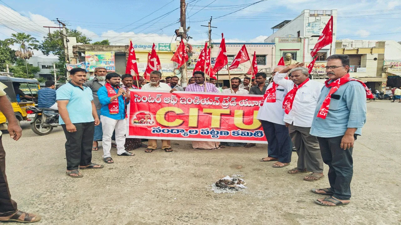 … కేంద్రంలోని బీజేపీ ప్రభుత్వం కార్మిక వ్యతిరేక లేబర్ కోడ్స్ను అమలు చేయడాన్ని నిరసిస్తూ జీవో ప్రతులను మున్సిపల్ వర్కర్స్ యూనియన నాయకుడు నాగేశ్వరరావు అధ్యక్షతన దహనం చేశారు. సీఐటీయూ పట్టణ కార్యదర్శి గోపాలకృష్ణ మాట్లాడుతూ బీజేపీ ప్రభుత్వం కార్మికులకు ద్రోహం చేసే విధంగా కార్మిక చట్టాలను యజమానులకు అనుకూలంగా మార్చడం దుర్మార్గమన్నారు. కార్యక్రమంలో సీఐటీయూ పట్టణ అధ్యక్షుడు ఉస్మానబాషా, మున్సిపల్ వర్కర్స్ యూనియన నాయకులు బాసిద్, నాగన్న పాల్గొన్నారు.