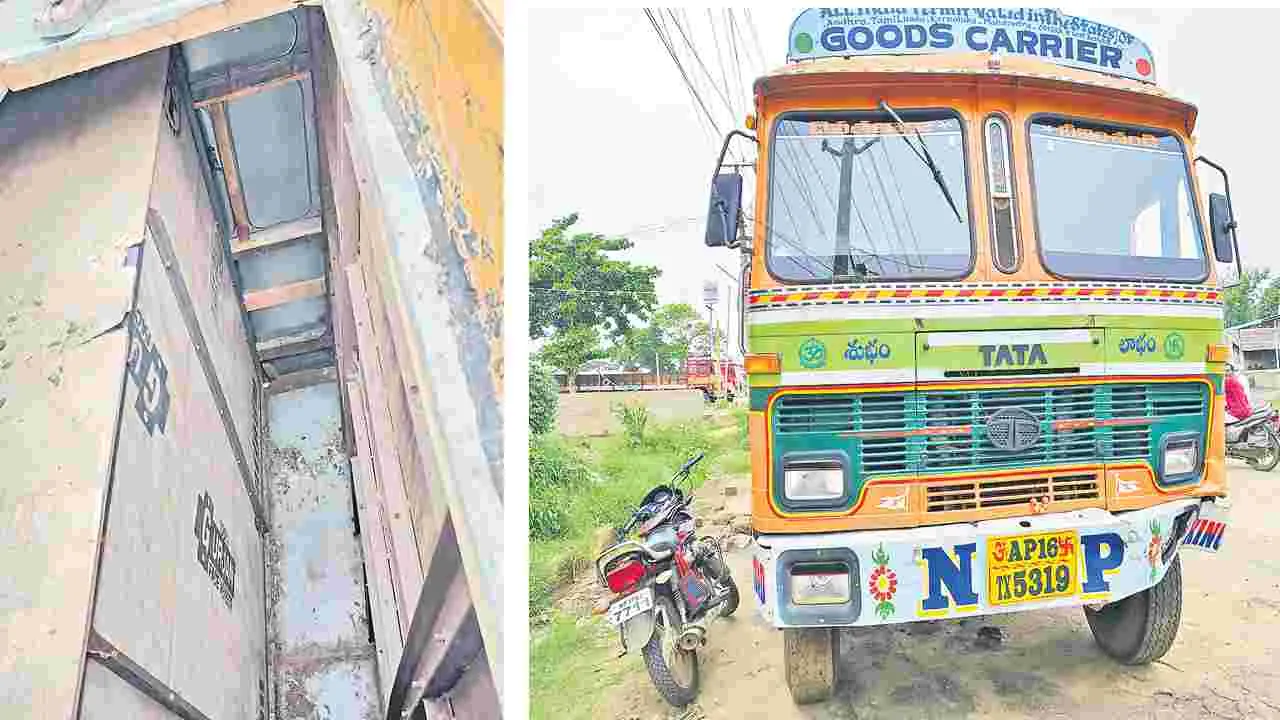 లారీ క్యాబిన్లోని రహస్య అరలో బస్తాలు